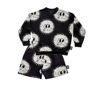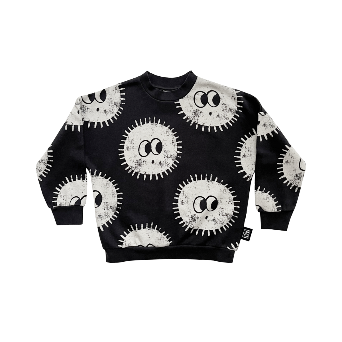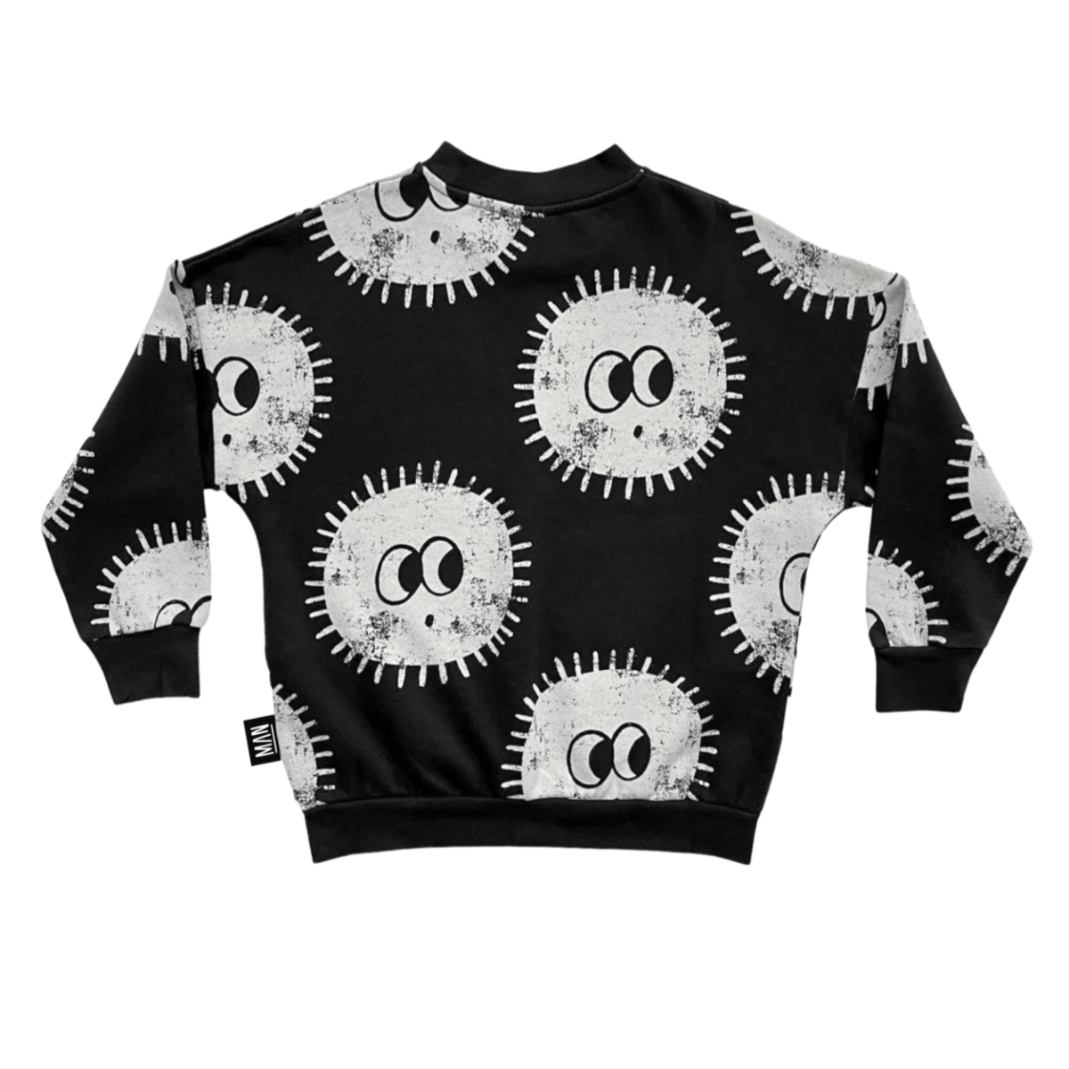 A soft, relaxed fitting, drop shoulder sweatshirt featuring an all over sunshine face print on a black base. Designed for boys and girls alike.