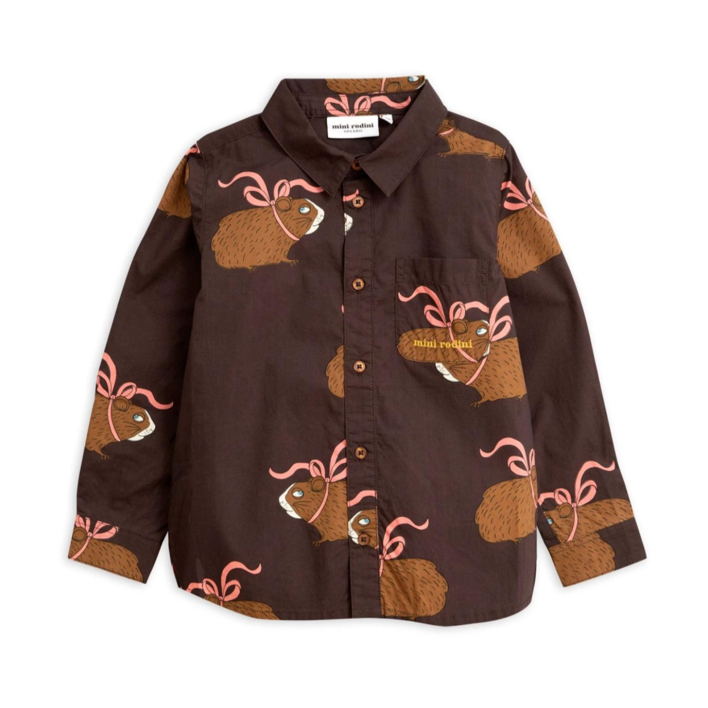 A unique and playful collared shirt featuring an all over adorable guinea pig print in brown. A collar and button down long sleeve adorn this shirt for a modern and fun look.