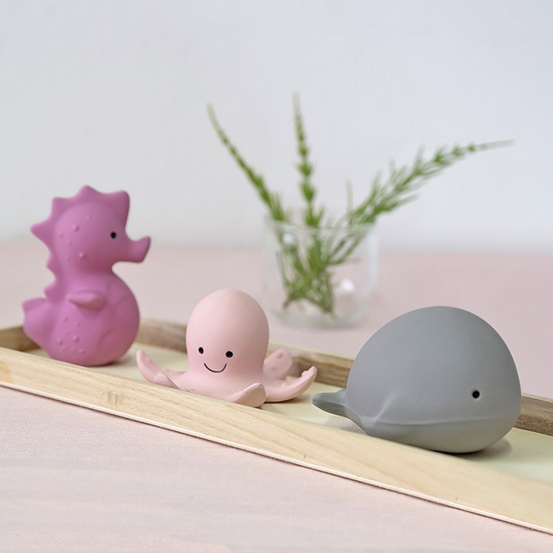 A fun little whale that loves to swim with its friends. This ocean buddy makes a fantastic addition to bath time or water play. This sweet whale has an enclosed rattle that creates a soft sound when shaken.