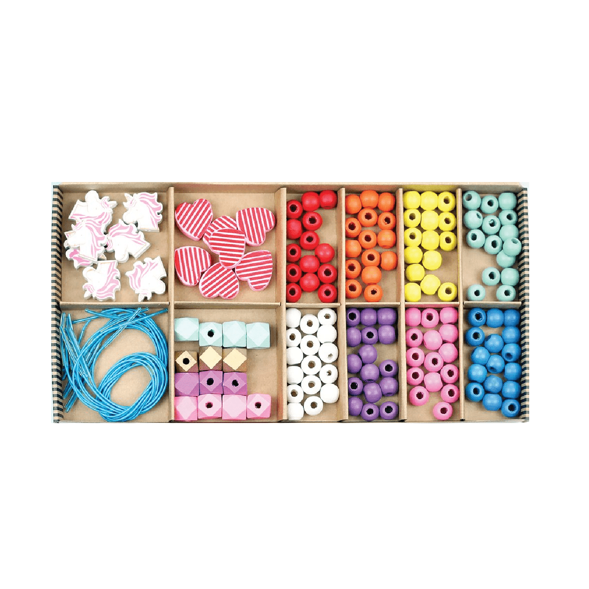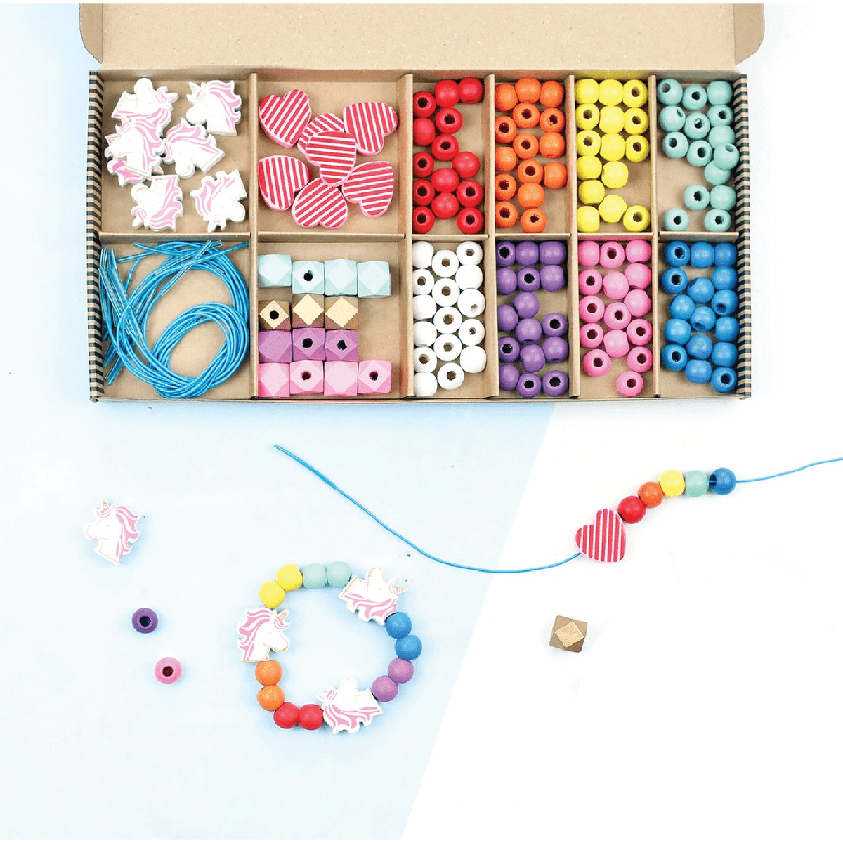 Calling all unicorn and rainbow artists. This beautiful collection is for you. This kit includes a unique box filled with handmade wooden beads for up to 10 bracelets for any budding artist.