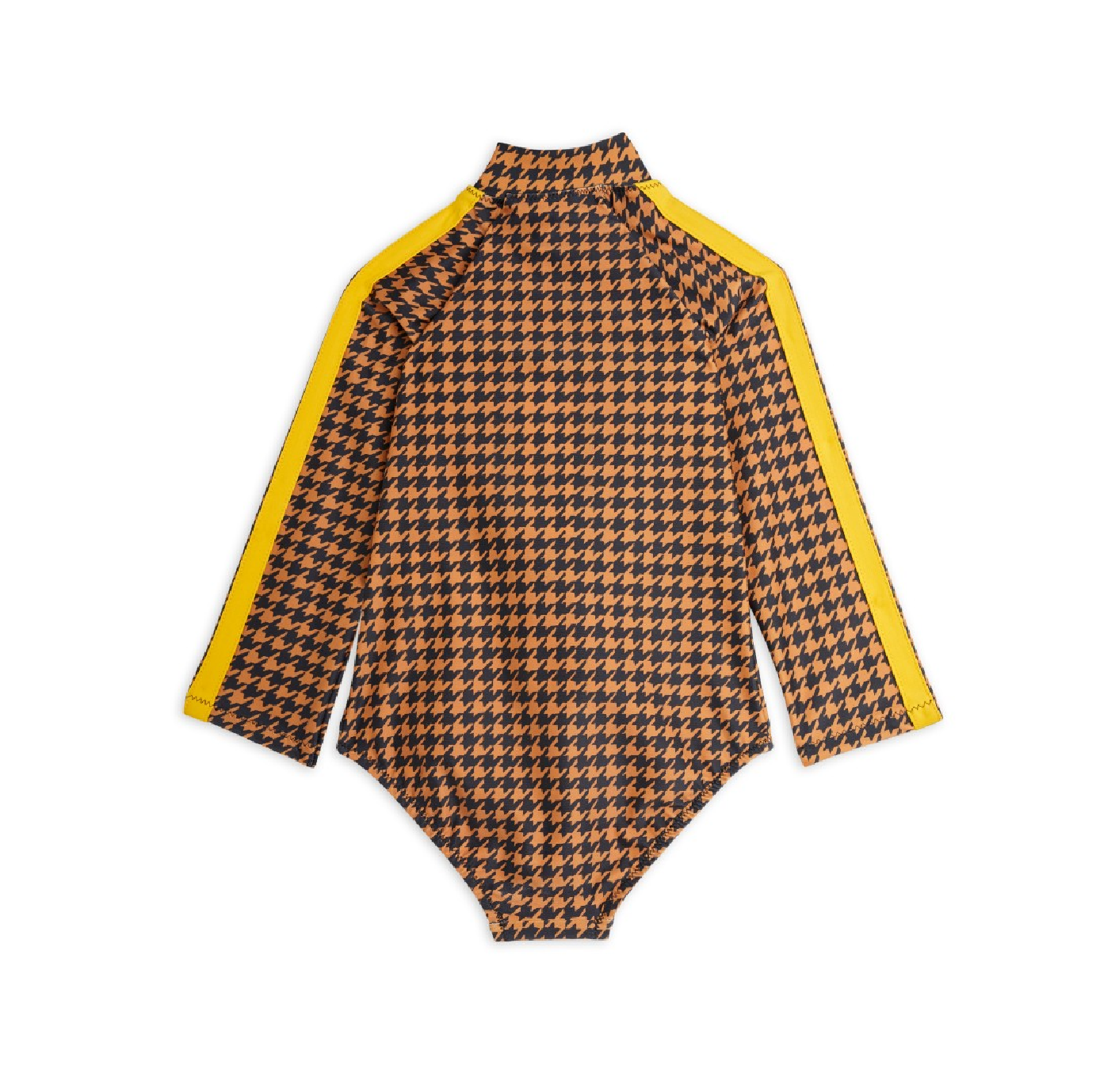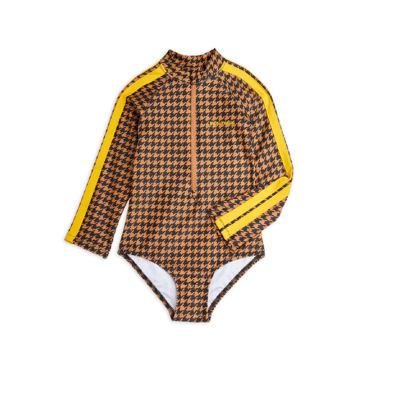 Swim in style with this Houndstooth printed UV suit, made from recycled polyamide with stretch. Designed with a high neck, long sleeves for protection and a zipper in the front for easy dressing. The fabric creates a physical barrier against the sun's UV rays with the highest ultraviolet protection factor, UPF 50+.