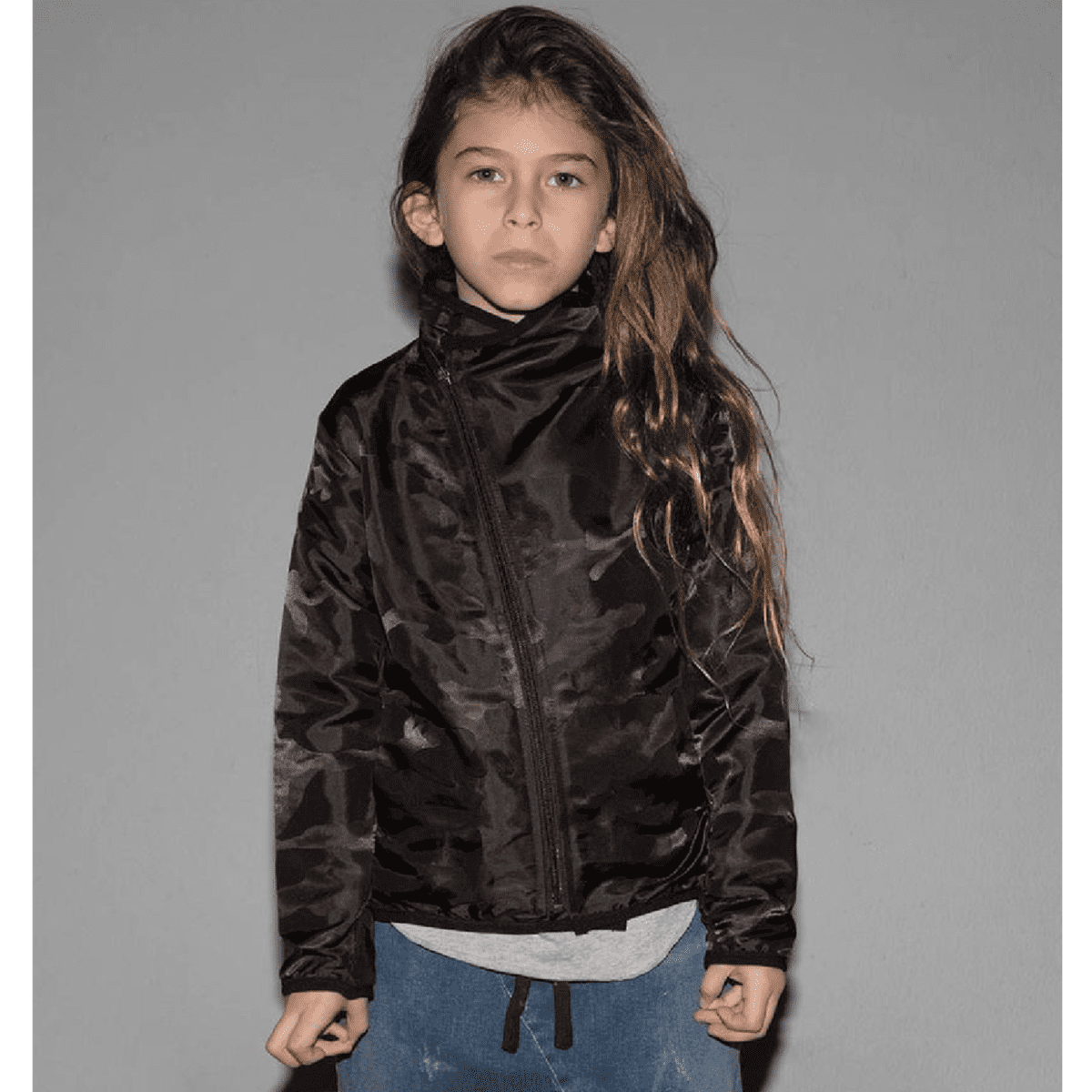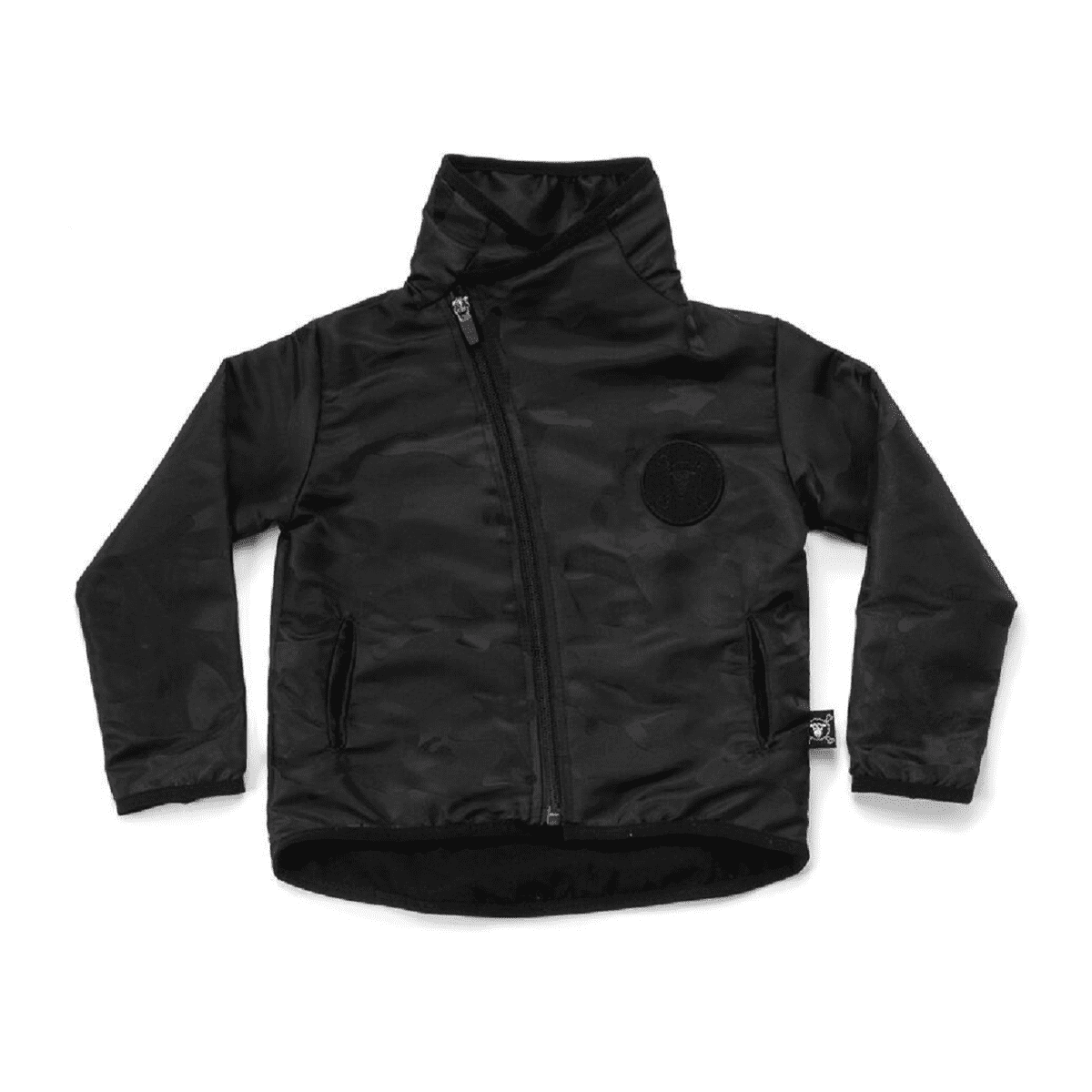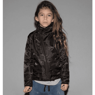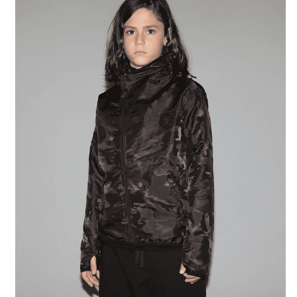 A lightweight jacket featuring an all over dark camouflage print, diagonal zipper and high collar.  Fits true to size
