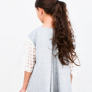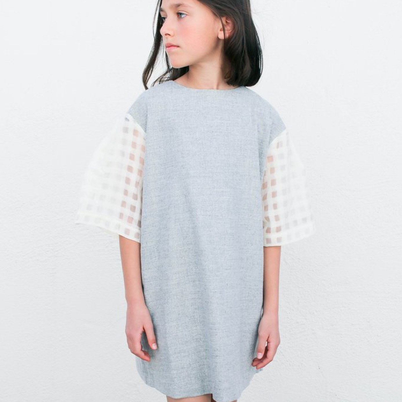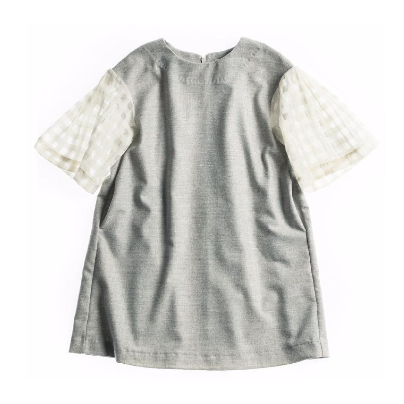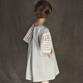 A beautiful and luxurious grey melange knit dress with a beautiful sheer white, puffy grid sleeve.