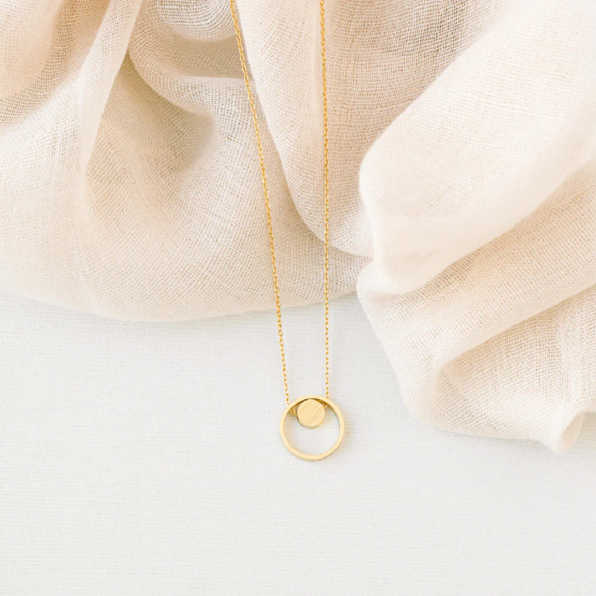 A beautiful double circle necklace with a brushed gold finish. A beautiful piece for yourself or a friend! Includes a beautiful matte triangular gift box.