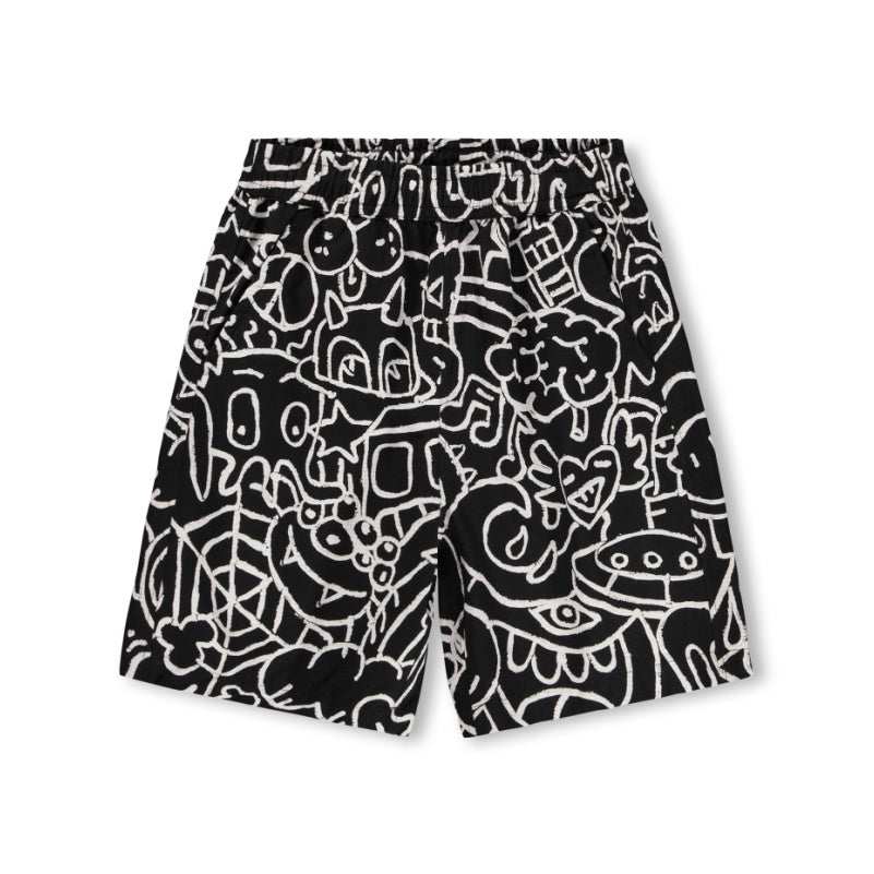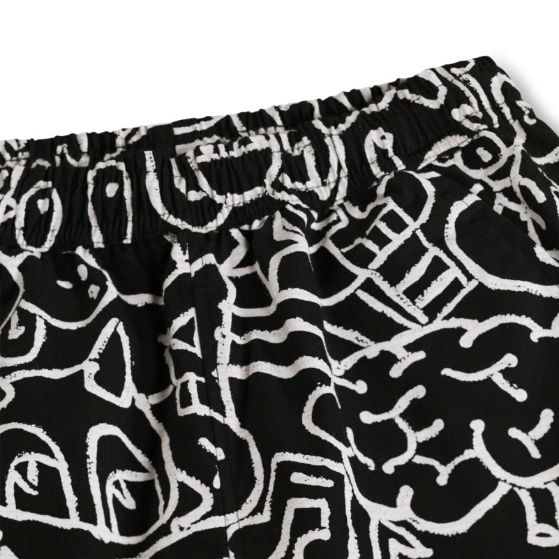A rad black and white elastic waist cotton short, features a cool cartoon over print.