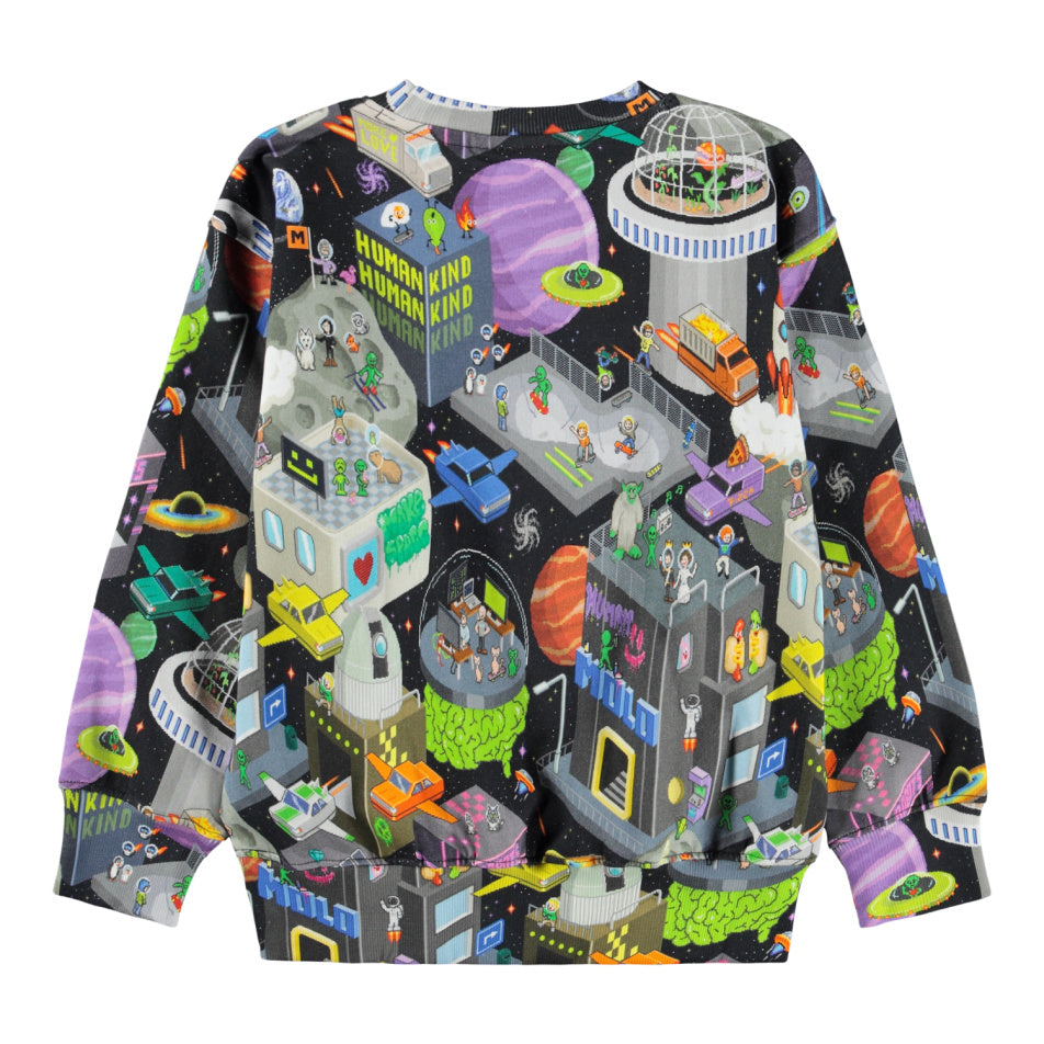 This rad oversized fit sweatshirt is made from organic cotton with a colorful all over unique design of an alien city and space-themed elements. Features a round neckline and ribbed edges.