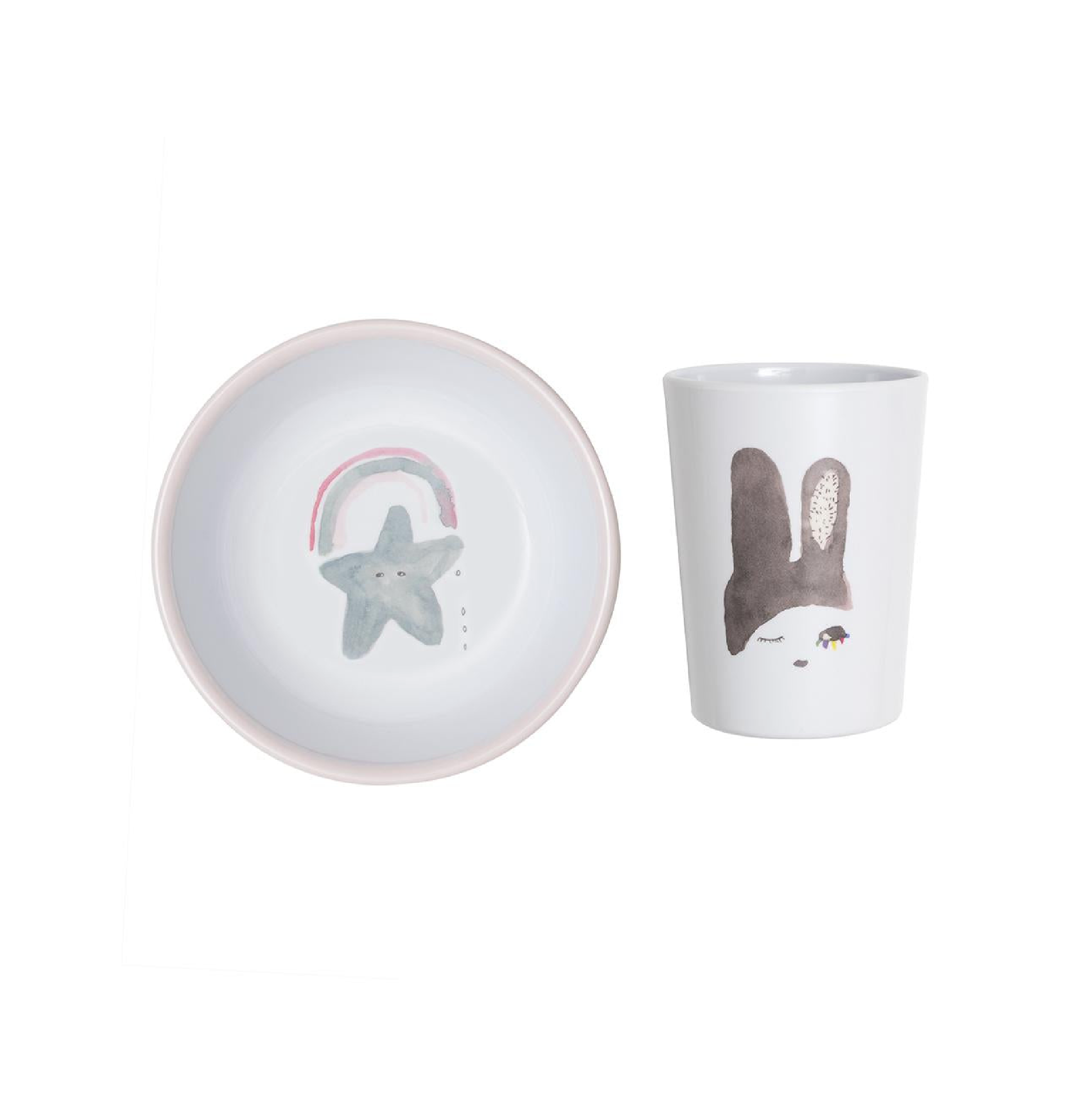 A gorgeous little bunny set. A winking bunny with rainbow eyelashes and a happy rainbow star. Wink Wink. This bunny set is sure to be a teatime favorite. For breakfast or teatime or pop in your picnic basket.