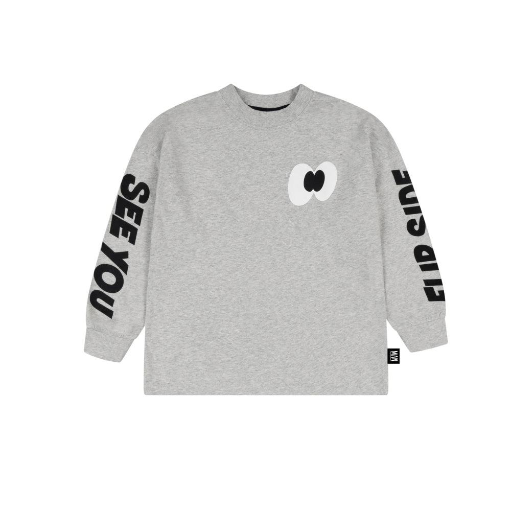 An oversized fit long sleeve shirt with a graphic eye print on the front, wording on the sleeves in organic cotton. High quality, designed to last with a unique flair for offbeat design mixed with surreal streetwear. Every LMH piece is made to clash, layer, and play-hard.