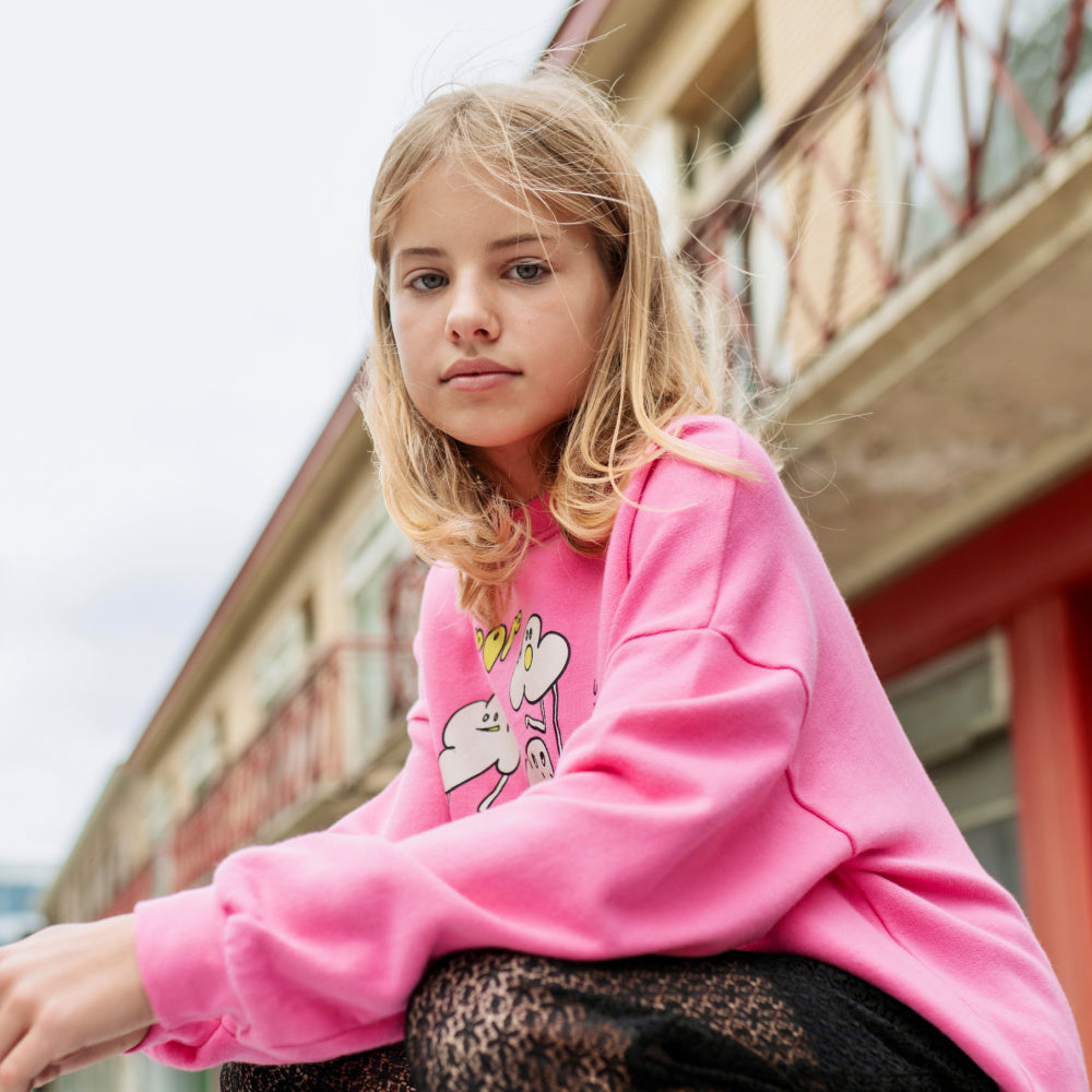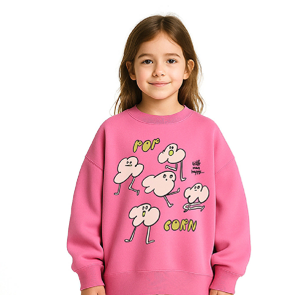 An oversized fit pink sweatshirt with a graphic popcorn print on the front in organic cotton. High quality, designed to last with a unique flair for offbeat design mixed with surreal streetwear. Every LMH piece is made to clash, layer, and play-hard.