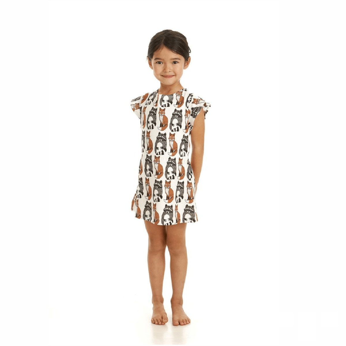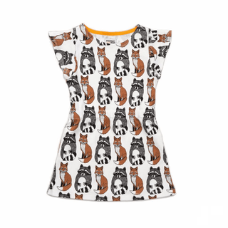 A playful all over print on a white base with wing sleeves and covered elastic at the waist.