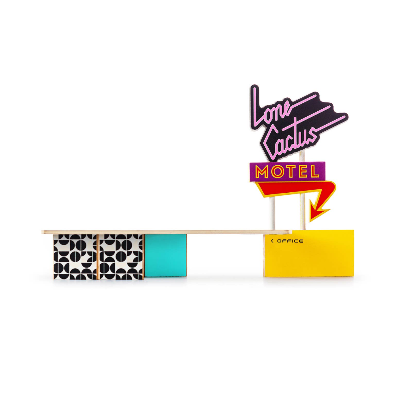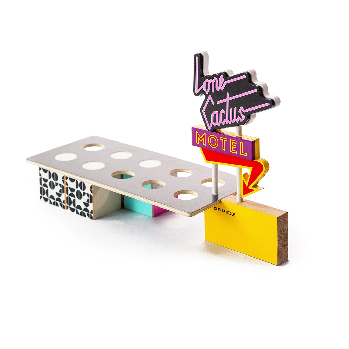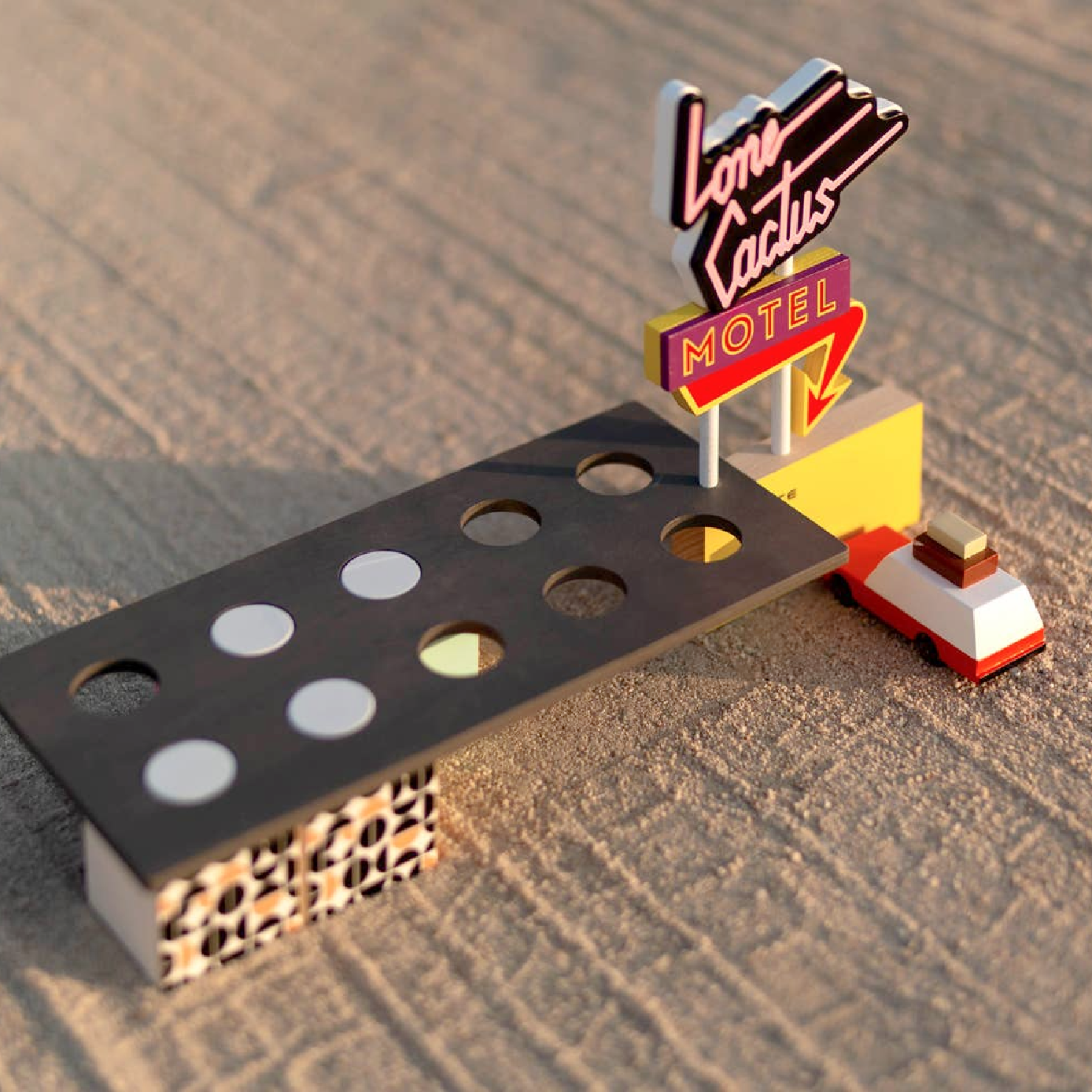 Designed for the SMALL Candycars. Remember, what happens at the Lone Cactus Motel - stays at the Lone Cactus Motel. Introducing our new Candycar compatible set. Decked out in mid-century patterns, free Wifi, and fresh coffee. You might not want to leave after you check in.