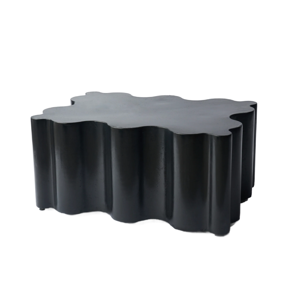 Organic scalloped edge brutalist coffee table good or interior or exterior use. A stunning contract-grade piece that meets commercial demands as well as residential.  Features adjustable plastic levelers so the concrete never actually touches the ground and can easily be moved/slid across floors without the risk of scratches.