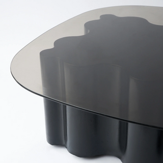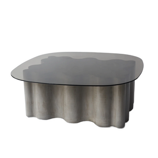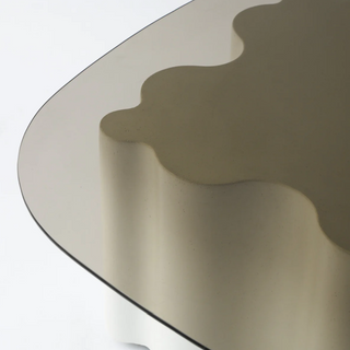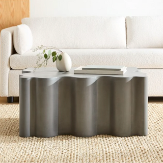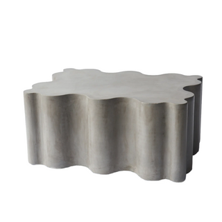 • Organic scalloped edge brutalist coffee table good or interior or exterior use. A stunning contract-grade piece that meets commercial demands as well as residential.  Features adjustable plastic levelers so the concrete never actually touches the ground and can easily be moved/slid across floors without the risk of scratches.