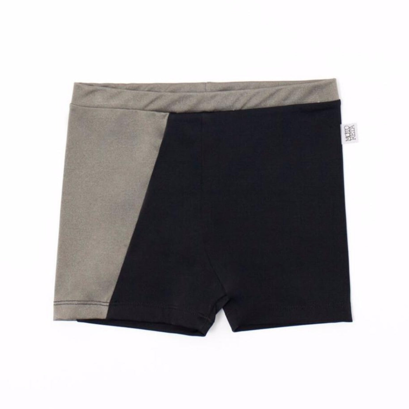 A beautiful and simple swim short crafted of black and silver stretch microfiber featuring a modern design.