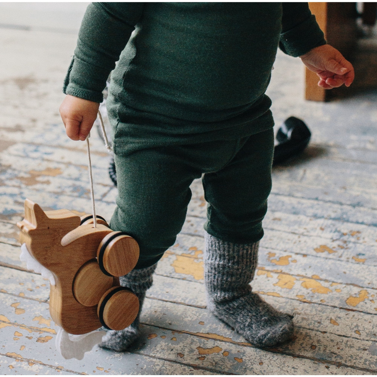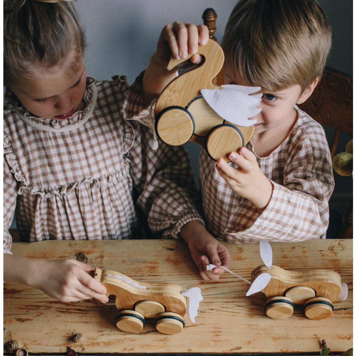 Handmade with durable bamboo and outfitted with rubber-rimmed wheels to prevent scratches to household surfaces, each animal makes a soft jingle sound when moved to stimulate active engagement. Development of fine motor and tactile skills, communication and creative thinking are supported as little ones grasp, roll, push and play with the figures.