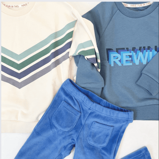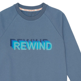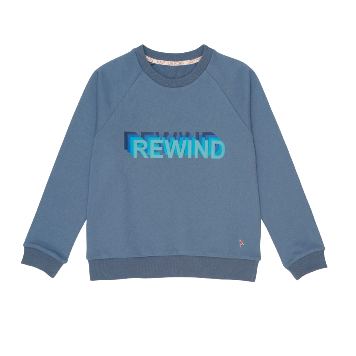 Rewind. Stop. Play. Pause. Inspired by our fave movies of the 80’s and 90’s, a vintage blue Rewind sweater with screen printed graphic will be their go-to sweater of the season.