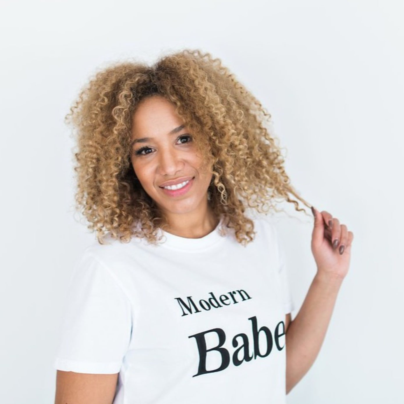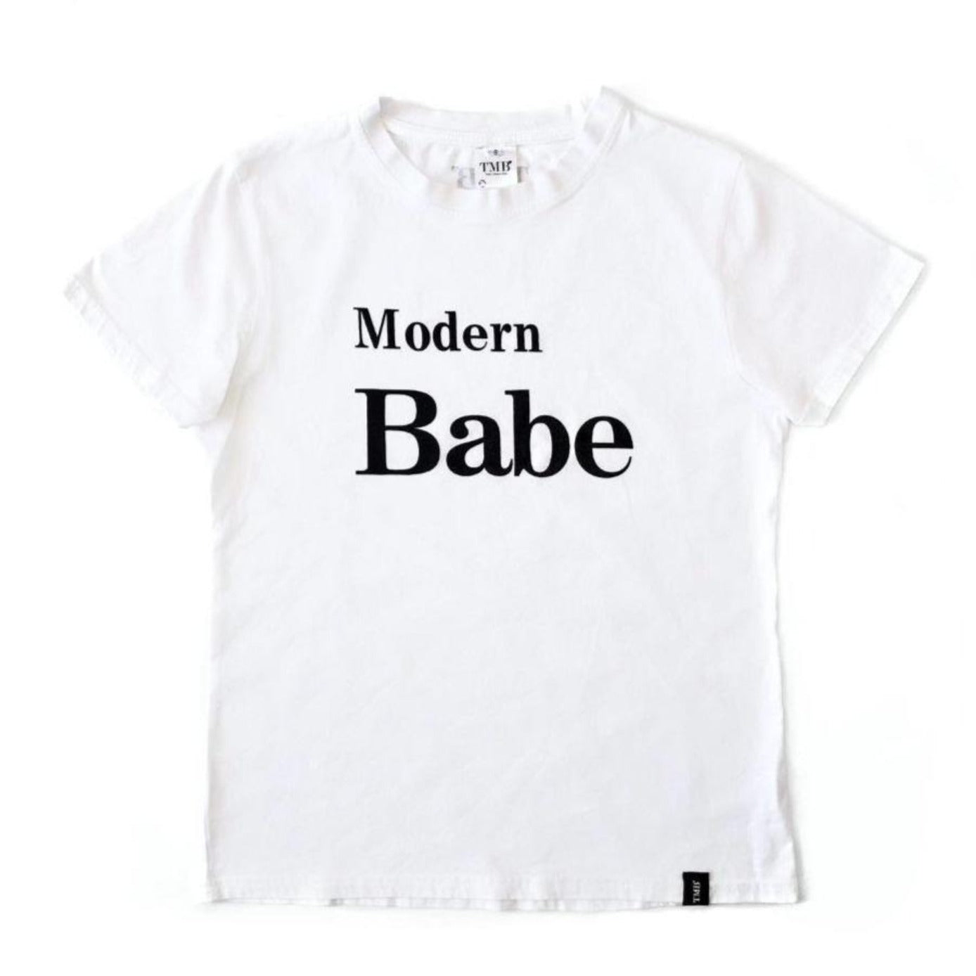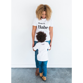 Match your sweet babe with the perfect t-shirt featuring a "Modern Bebe" print in black on an ultra soft white tee. Check out our Mini version... HERE  Size up for a looser fit.