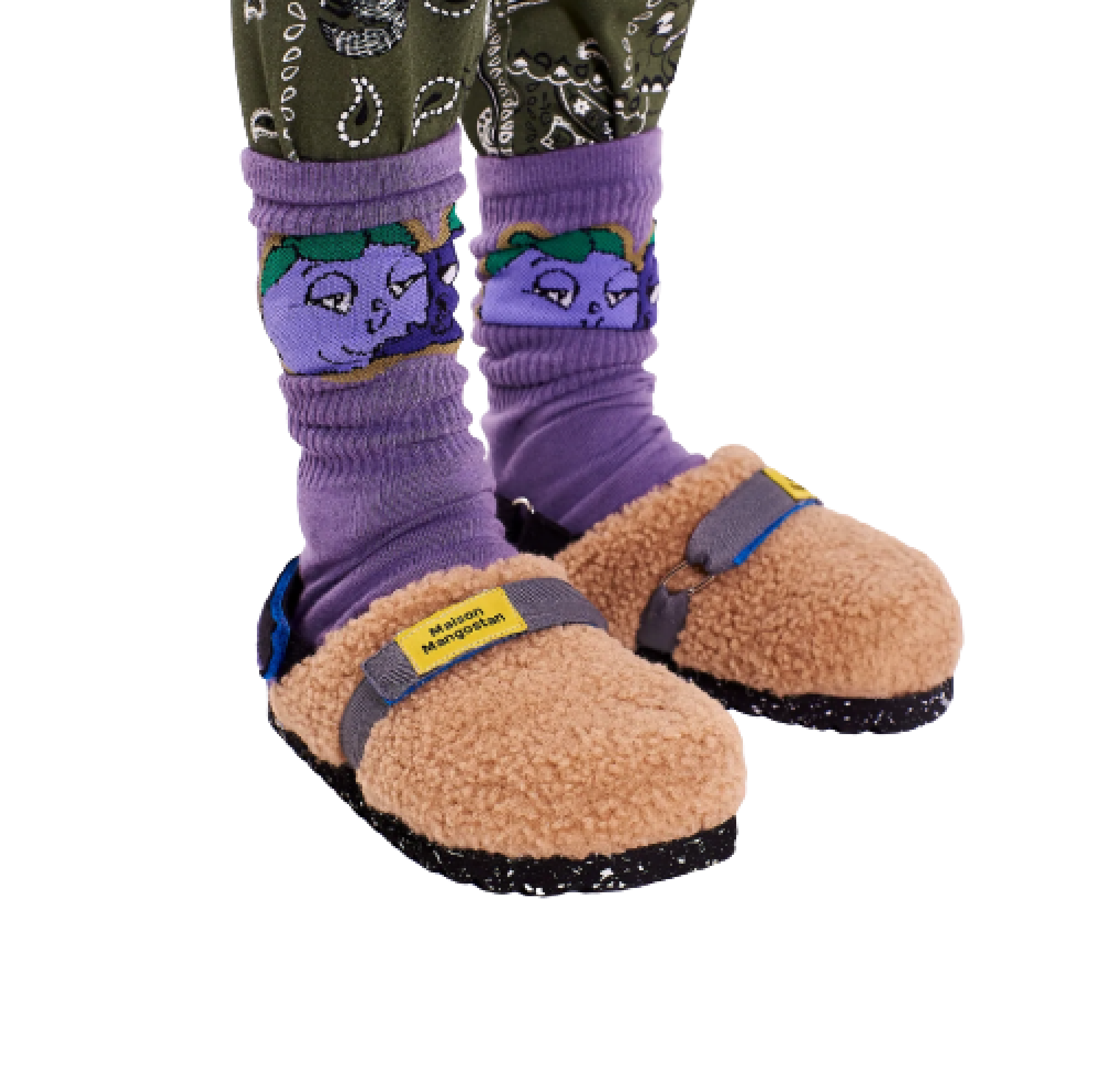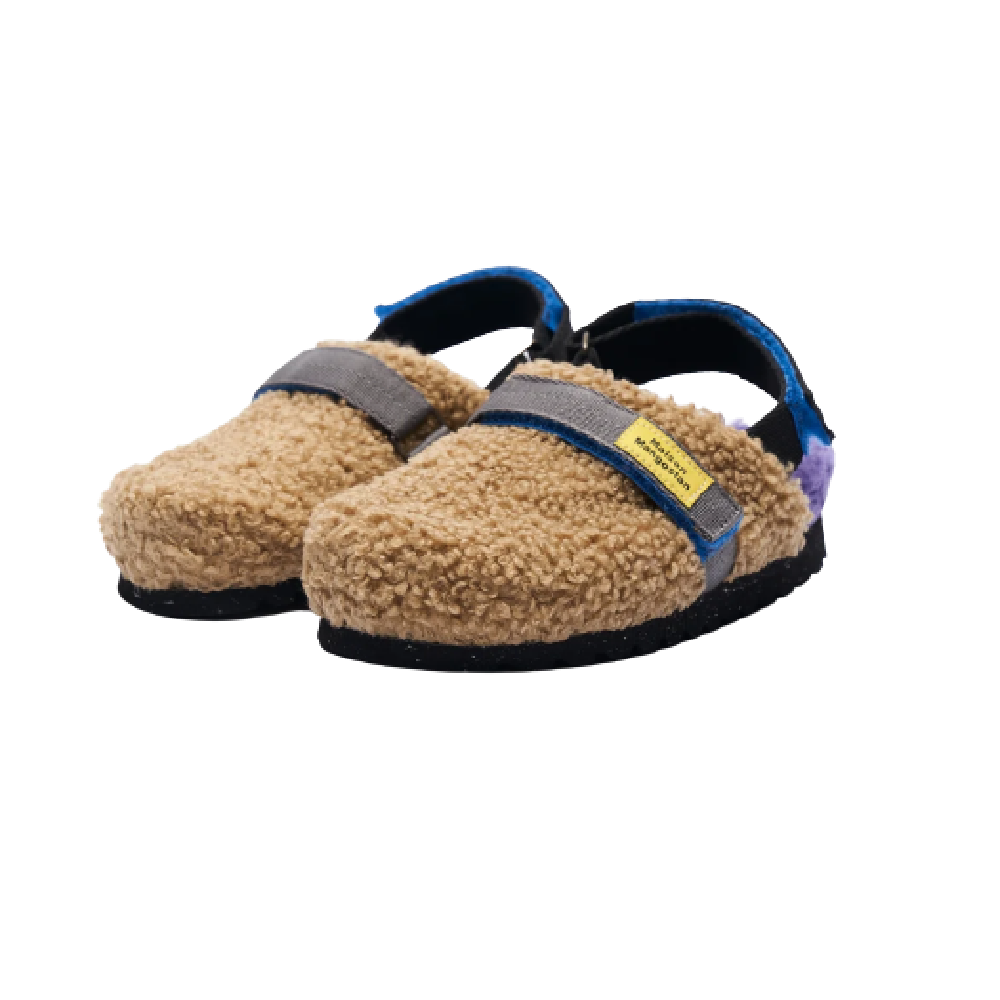 A really unique open back sandal featuring contrasting accents and a beautiful shearling fabric, adjustable velcro fastening strap and recycled sole. Designed for boys and girls alike.