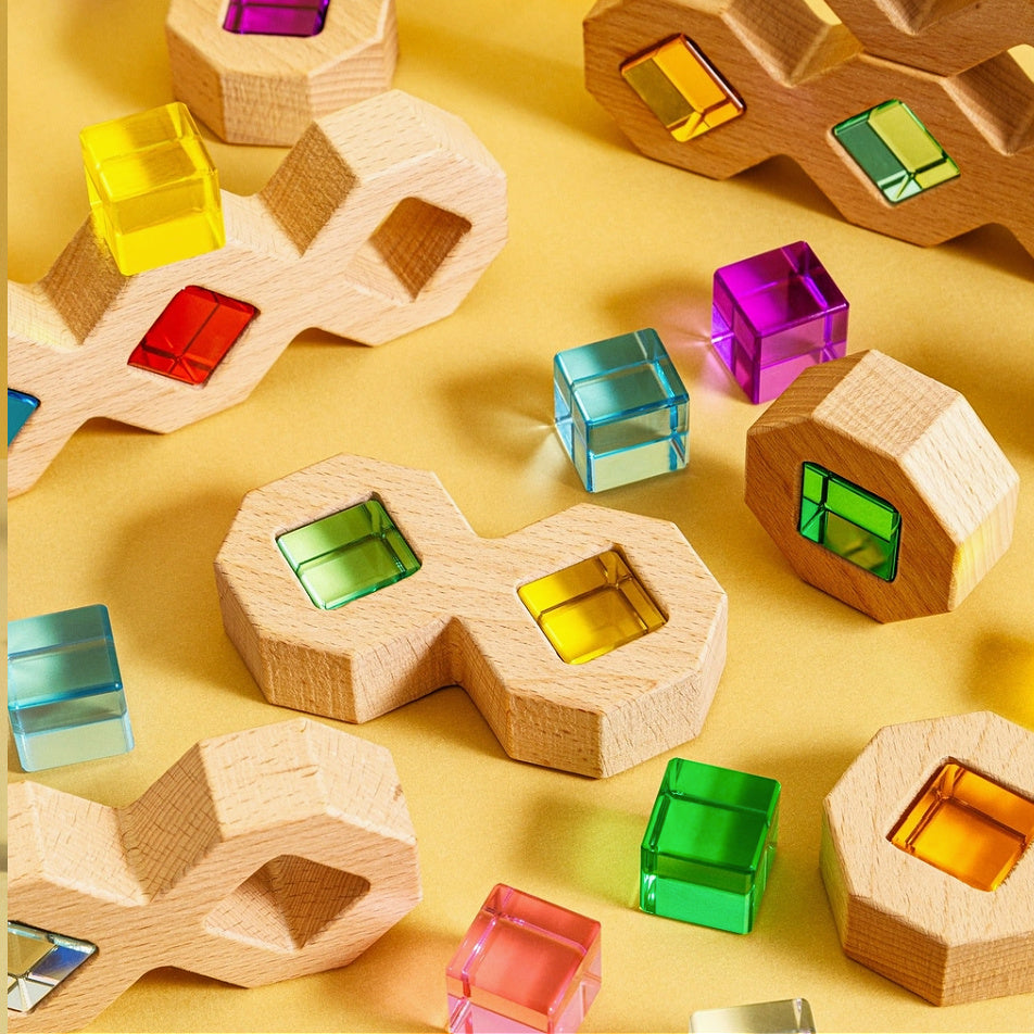 A gorgeous, high-quality beech wood and acrylic block set designed to be both engaging and educational. This set includes a mix of colorful lucite gemstones and untreated wooden stacking cubes in various sizes.