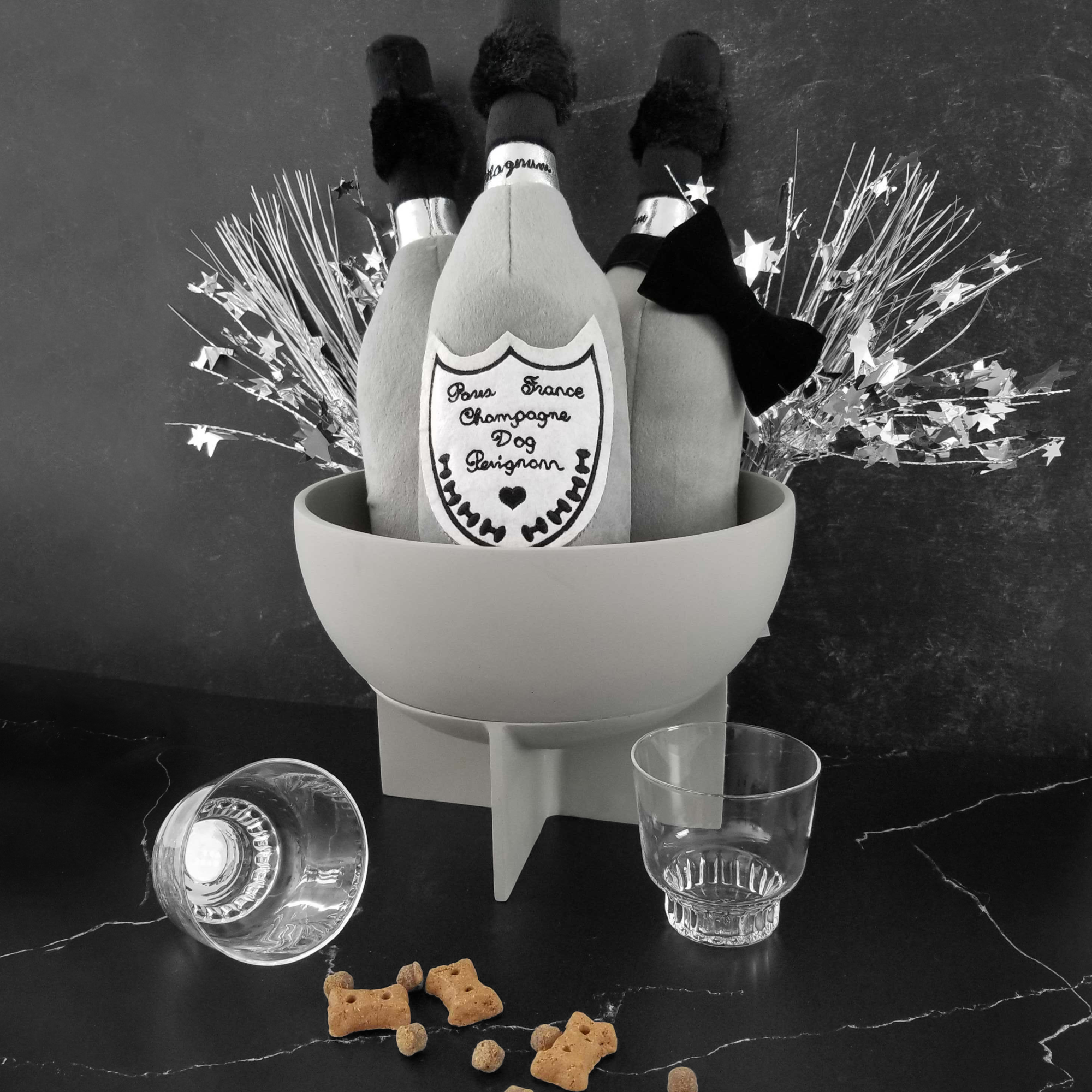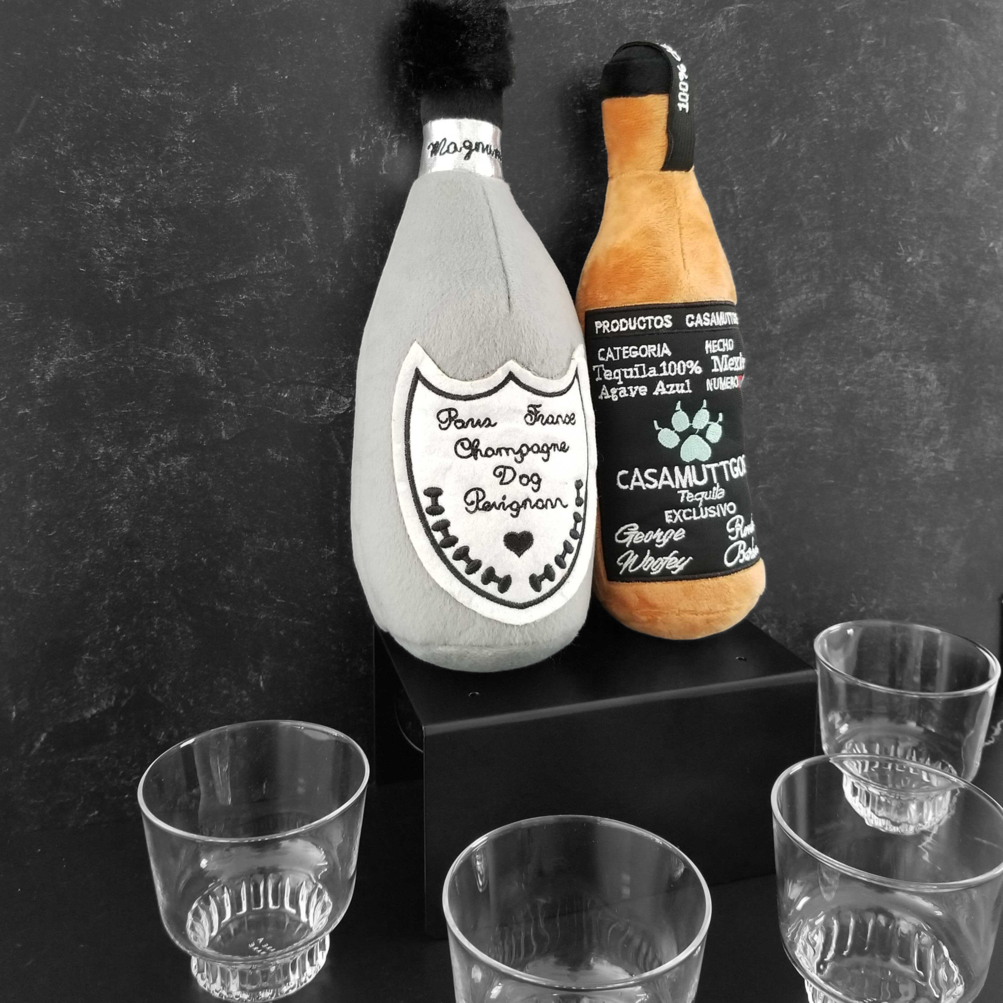 Uncork a bottle of bubbly fun from the Muttini Bar Collection! Dog Perignon is the perfect toy for any occasion. Plush exterior with a squeaky that drives dogs crazy. Every Pampered Pup should have one!