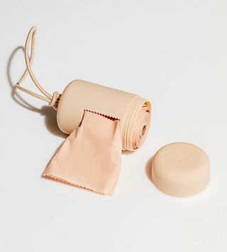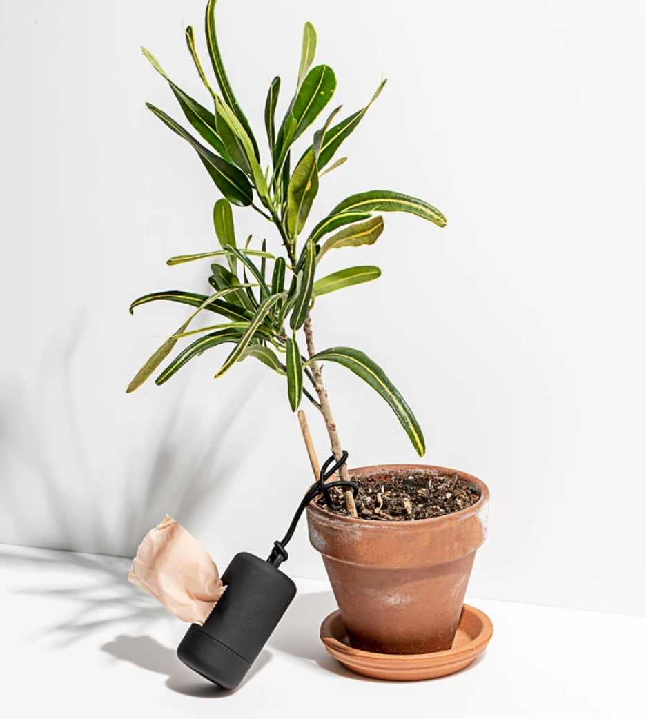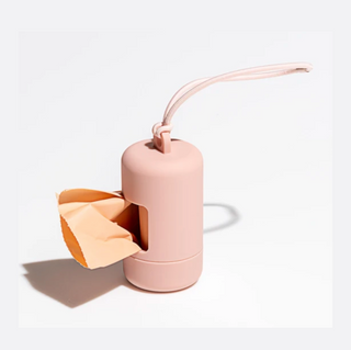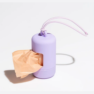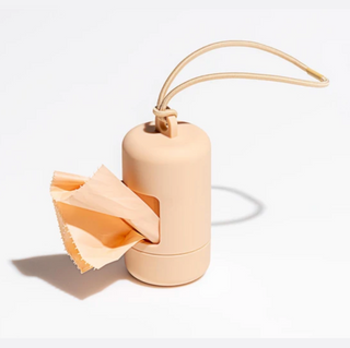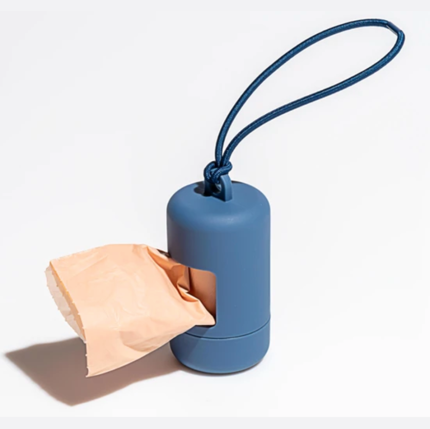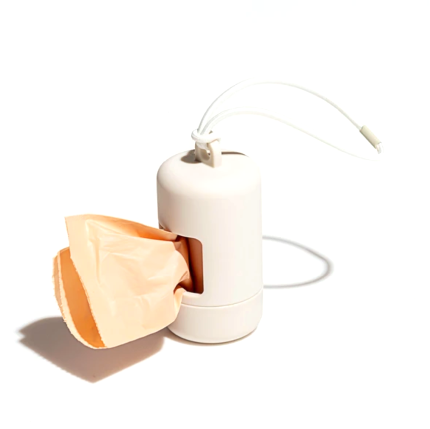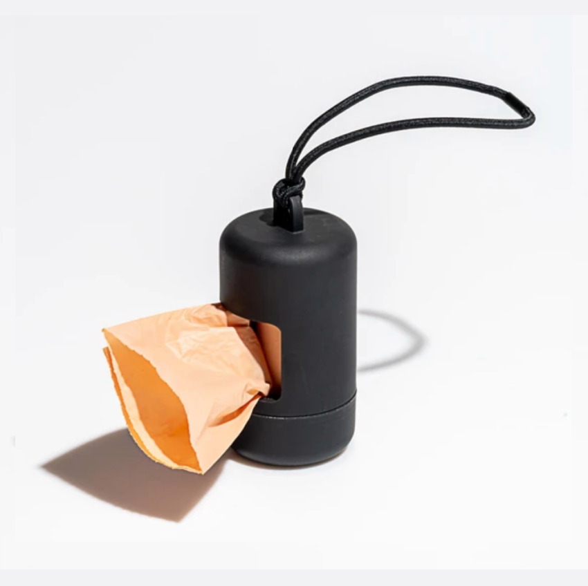 A proper home for poop bags. Elastic attachment that plays well with any leash or tote. Easy-twist top for quick re-loads. Includes a roll of 10 eco bags on us.