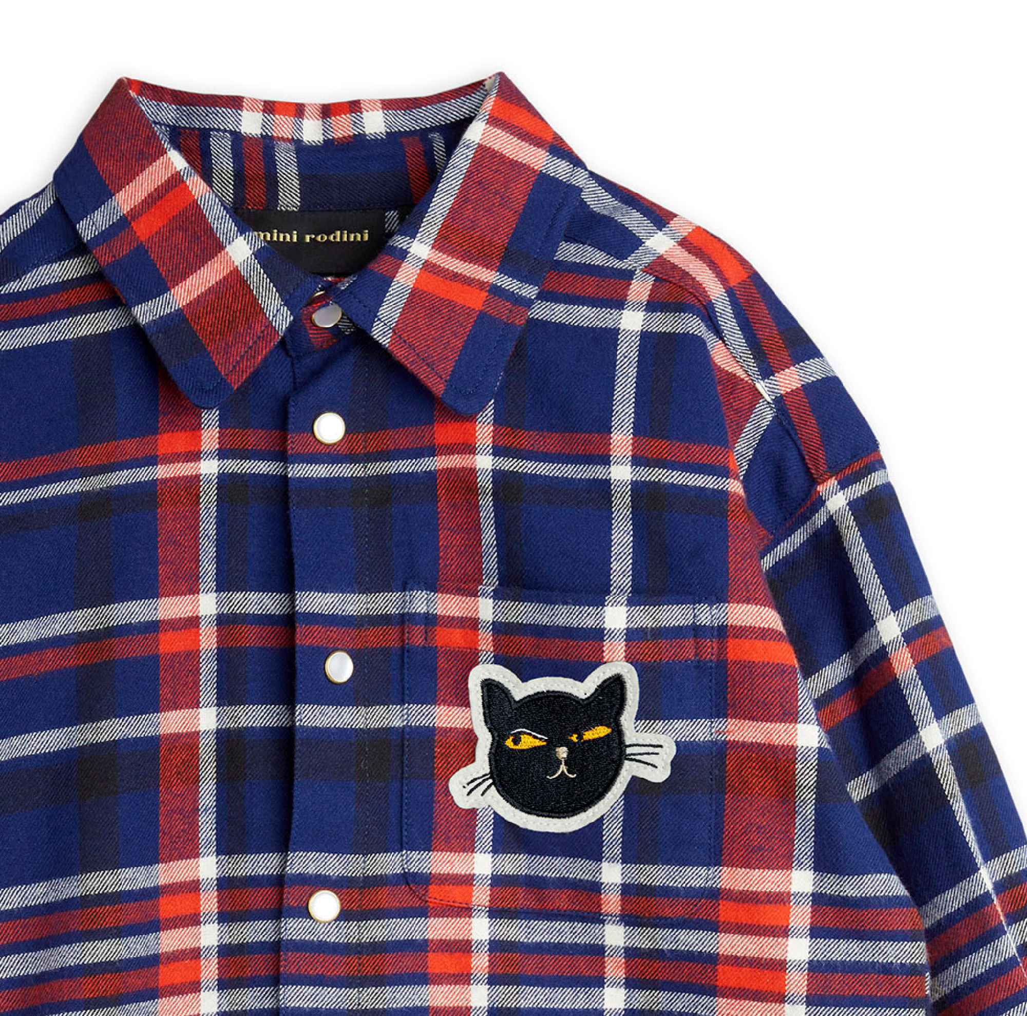A chic take on the flannel button shirt featuring an all over red and blue checkered print and black cat patch on the front pocket. Designed for boys and girls alike.