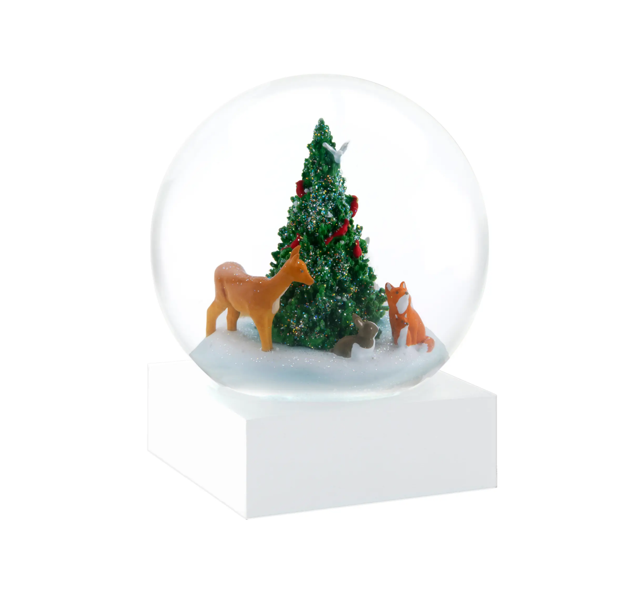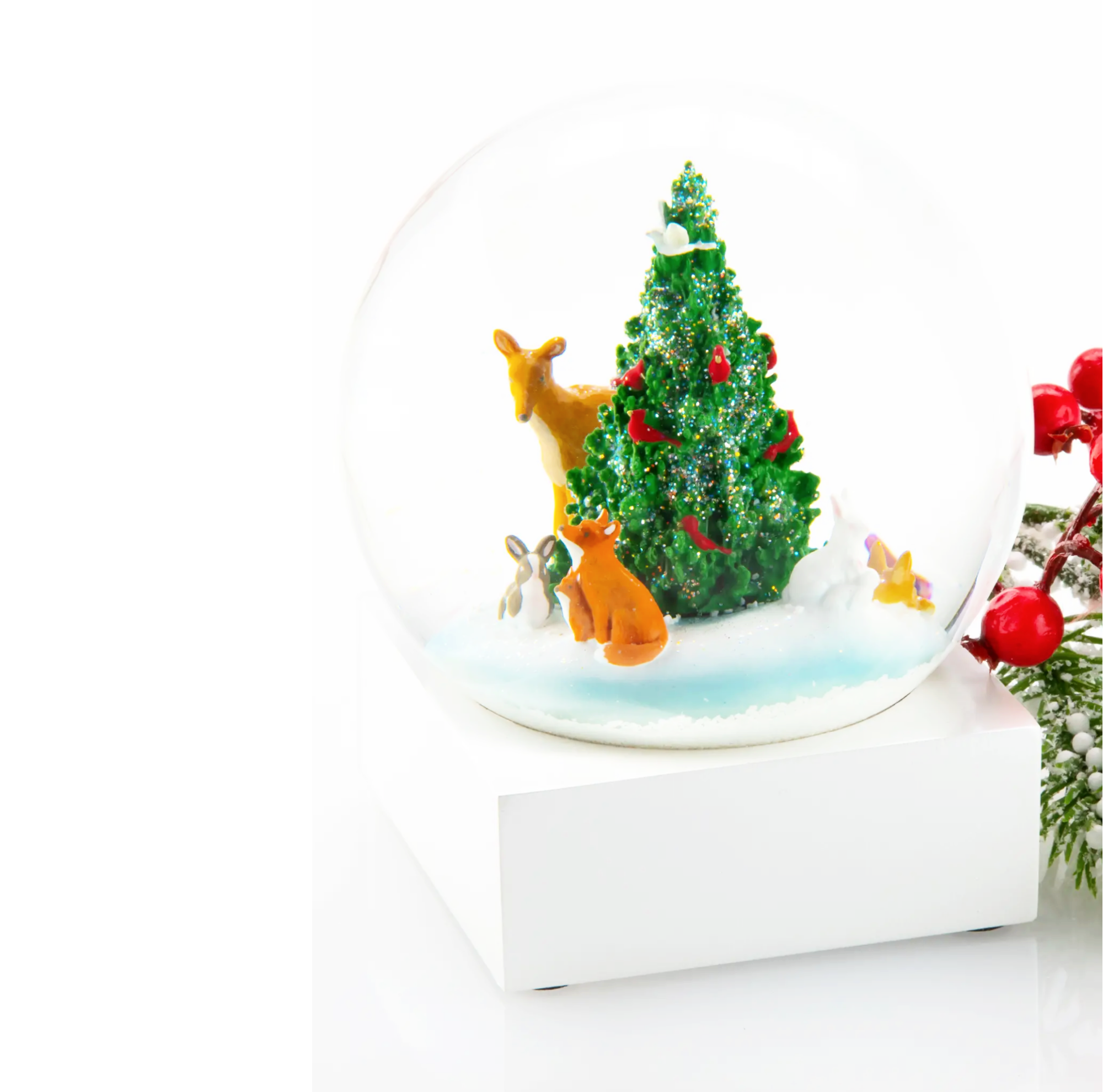 "A winter gathering of magical forest friends surrounds our snow dusted fir. As the cardinals gather for shelter in the branches, a delicate dove brings peace to the scene, settling atop the tree. A whisper as the snow falls…."