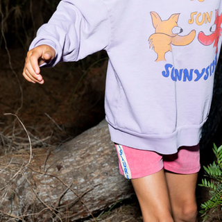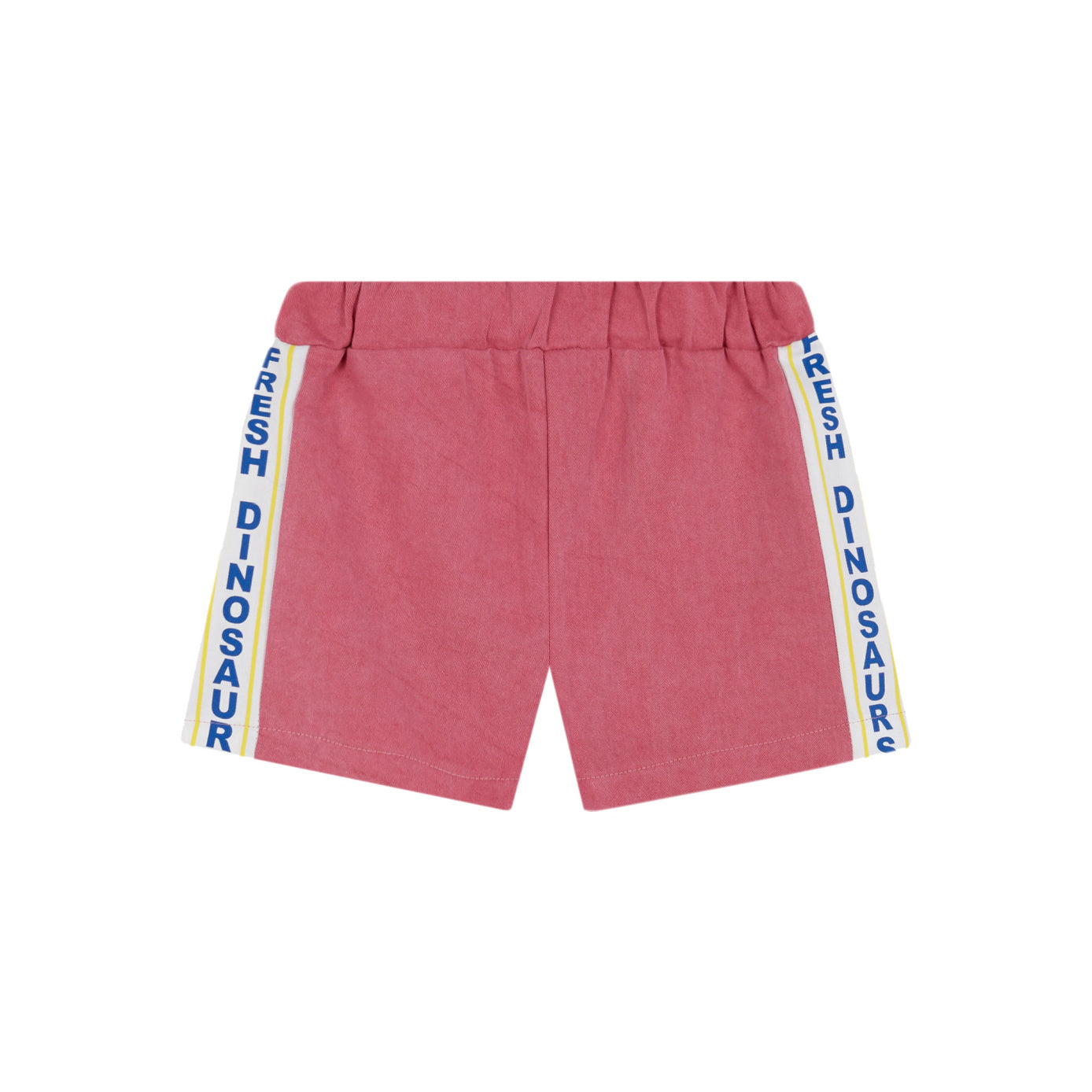 A rad short featuring a pink base with running Fresh Dinosaurs logo on the sides and an elastic waistband.