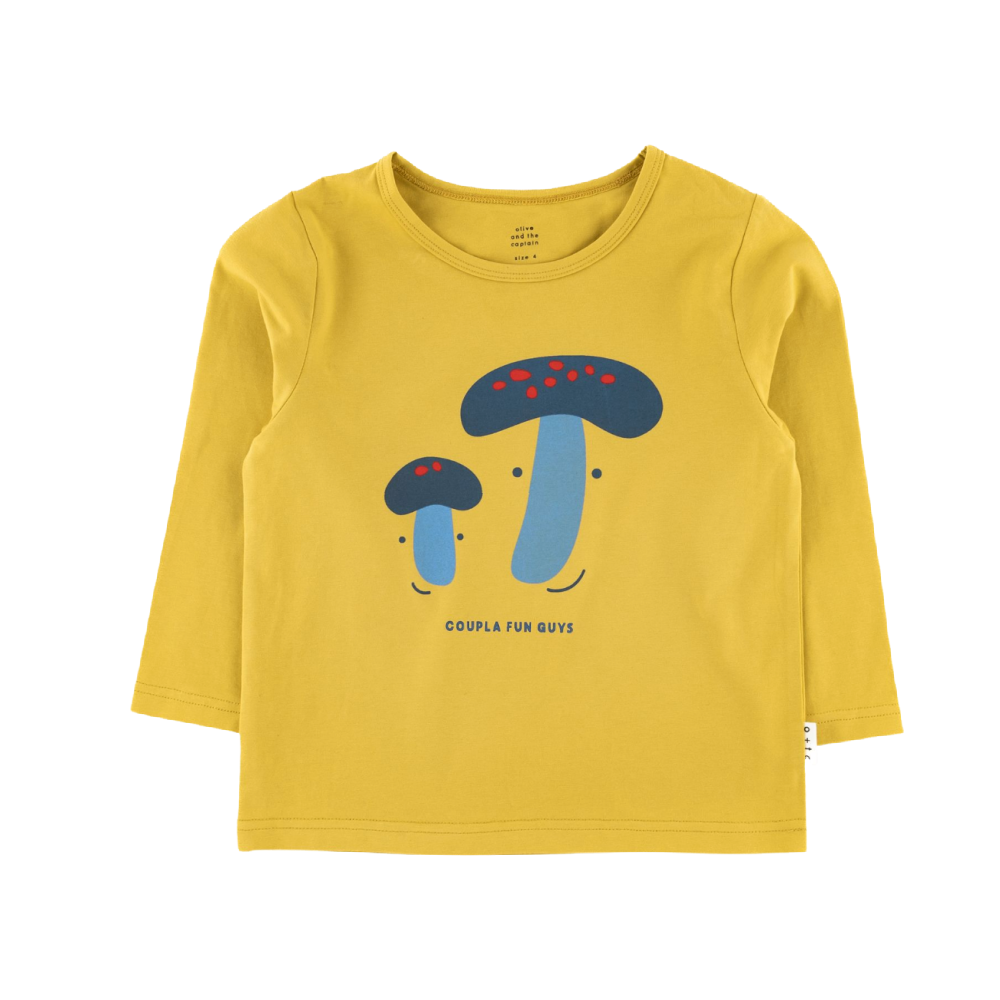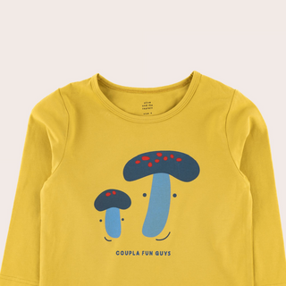 This super soft long sleeve tee has a playful mushroom print on a yellow base. Features high quality fabric for durability and maximum comfort and designed to get softer with every wash!