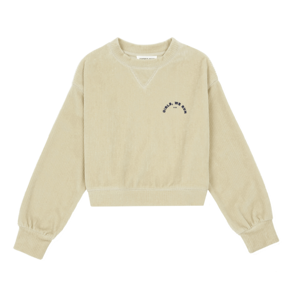 A rad and unique velour sweater featuring a motivational text embroidery.