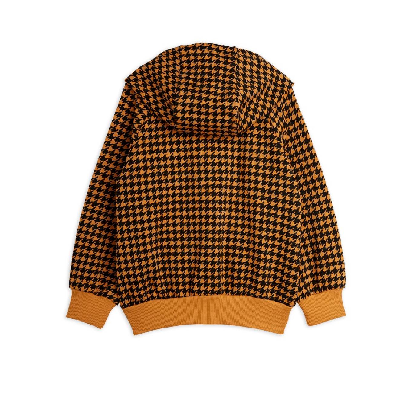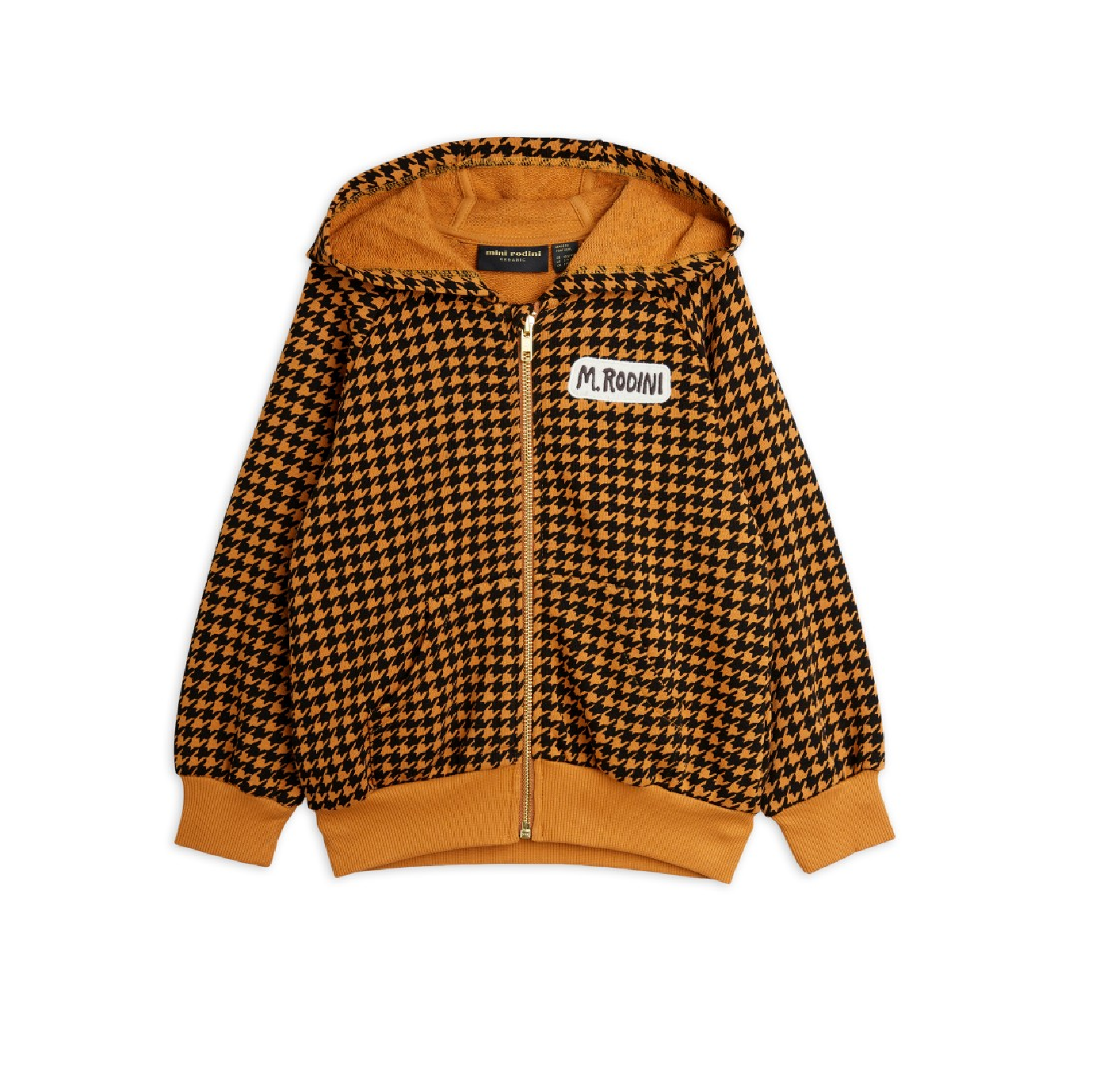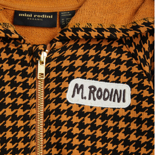 Comfy brown zip hoodie with the classic Houndstooth print that never goes out of style, made from 100 % GOTS certified organic cotton. The hoodie is designed with a golden metal zipper, two pockets in the front, an embroidered M.Rodini patch decorating the chest, raglan sleeves, as well as ribbed cuffs and bottom hem.