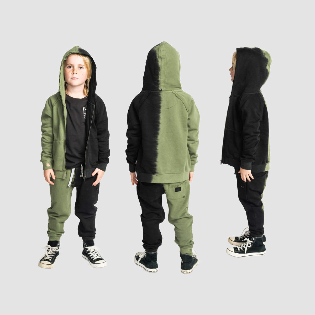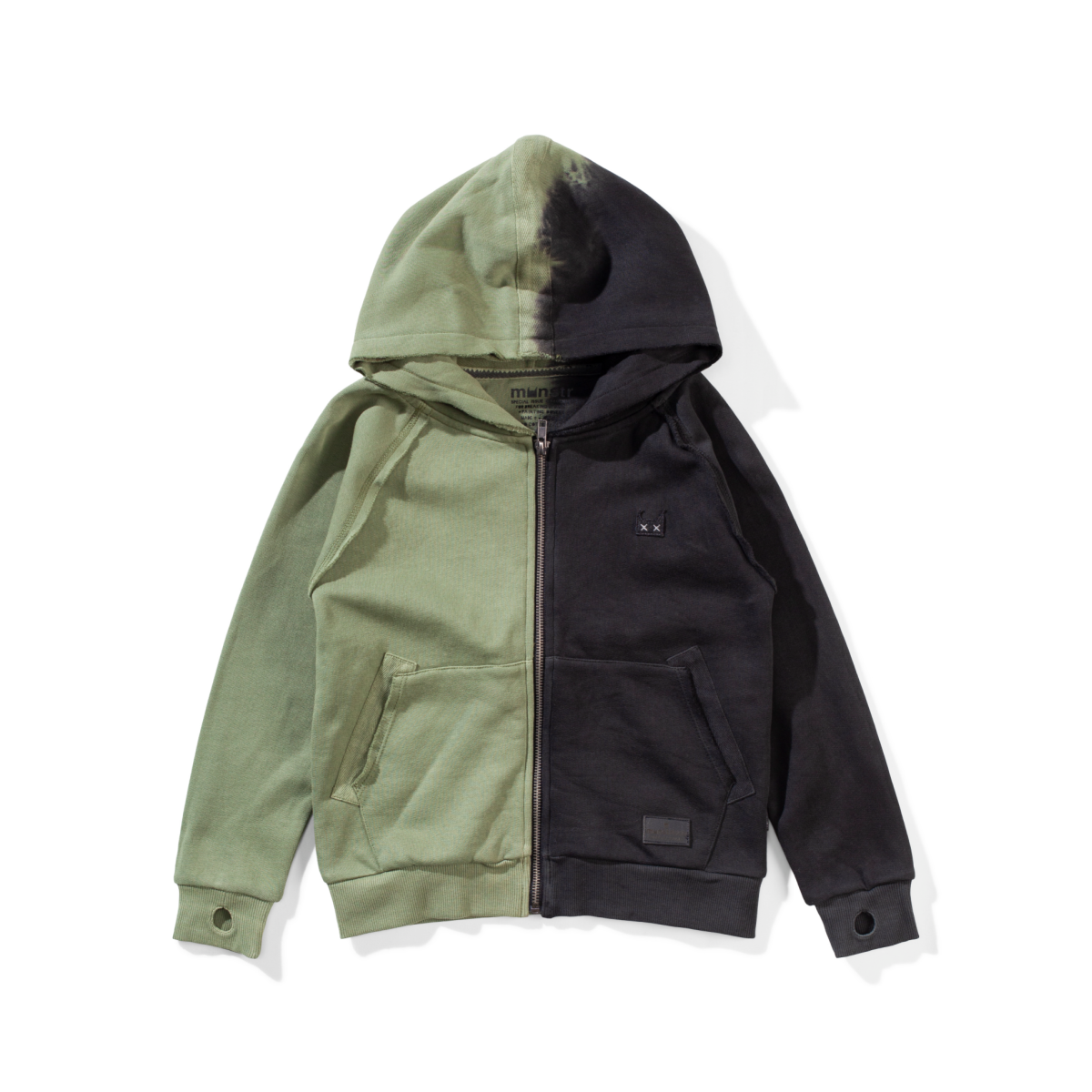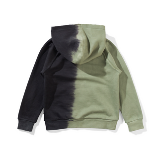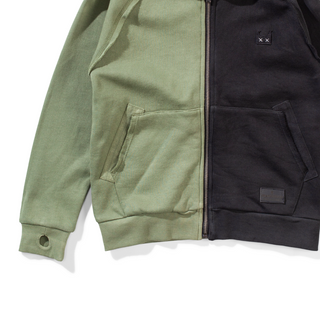 A rad hooded sweatshirt featuring a cool contrasting dual color, zipper front, finger holes, and kangaroo pocket.