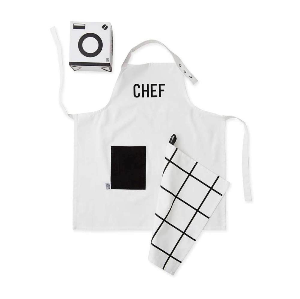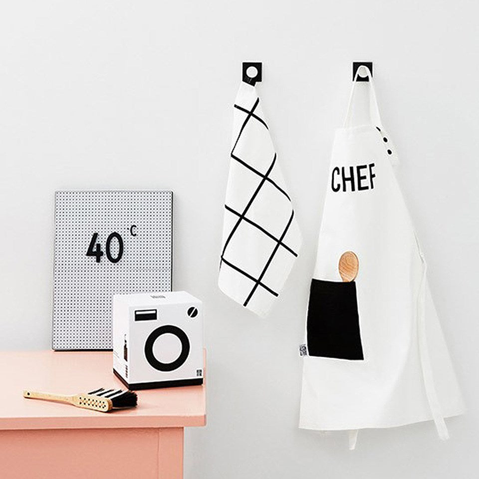 Stylish black and white apron and tea towel for kids.