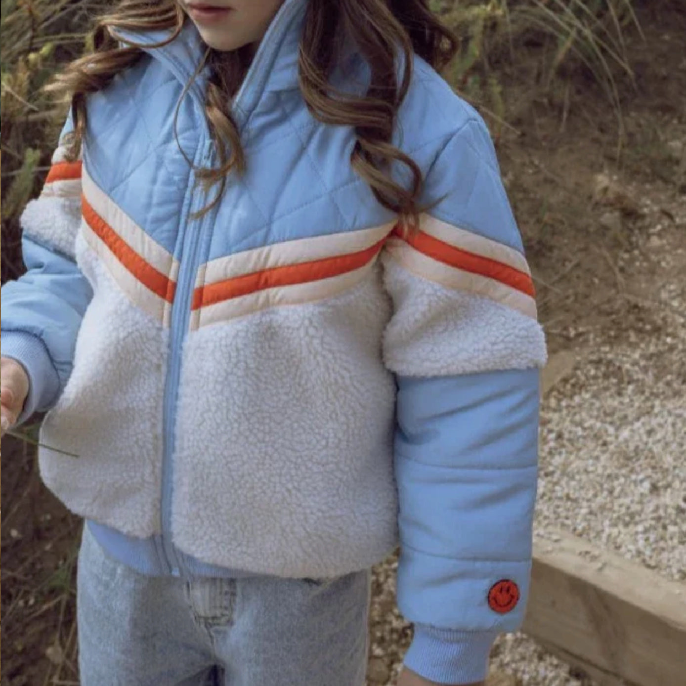 Featuring a fleece lining the Kobe jacket is designed to keep little bodies warm and super stylish. This jacket is lightly padded, features pockets and a smiley face patch on the sleeve.