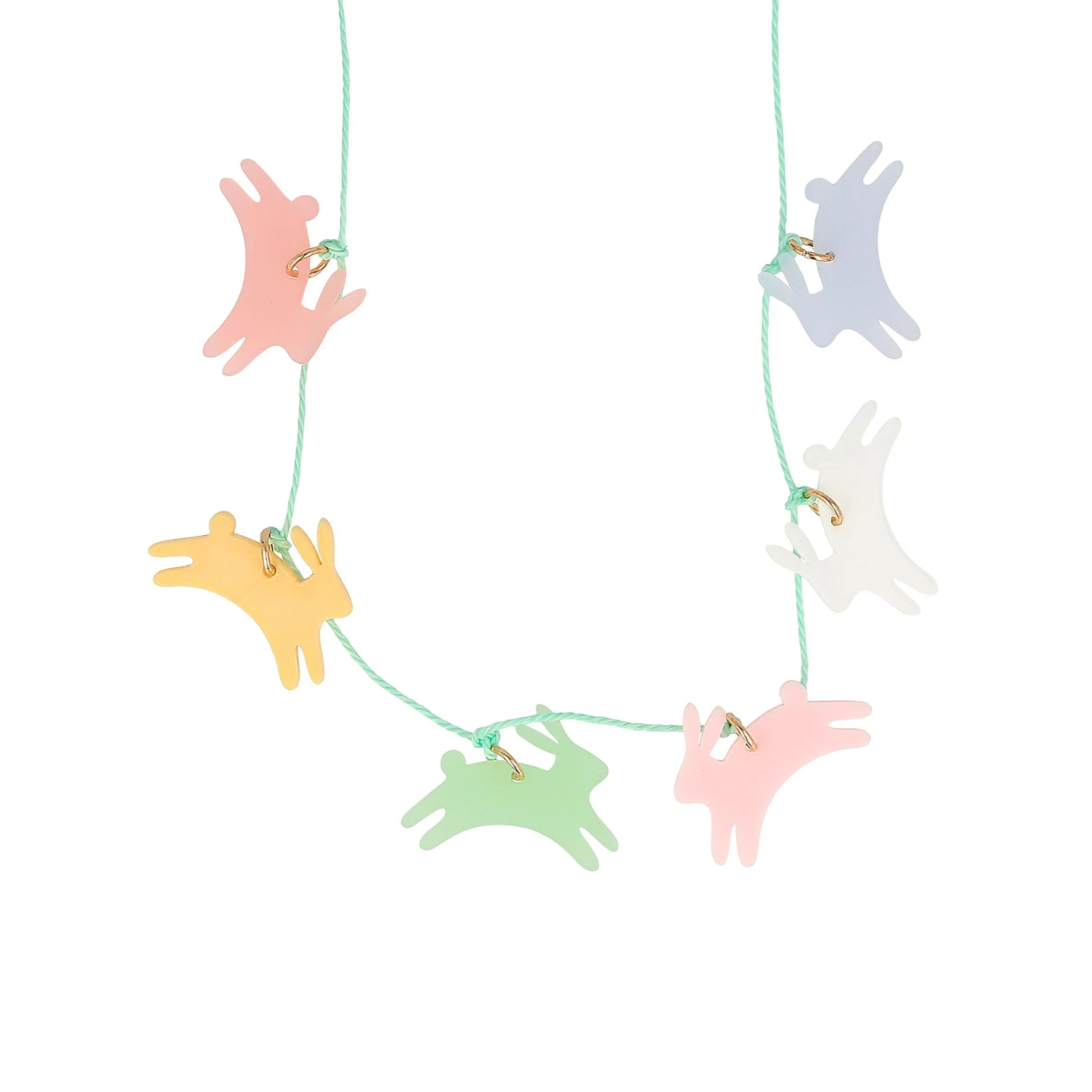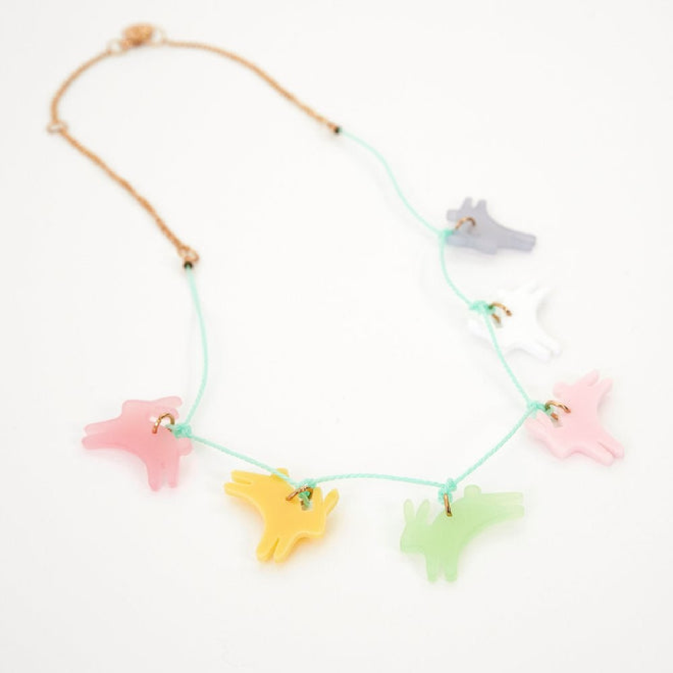 This bunny necklace is a wonderful accessory to wear to Easter, or springtime, parties. The bunnies are crafted from acrylic, with a gold tone chain and mint cord necklace with an 11" drop.