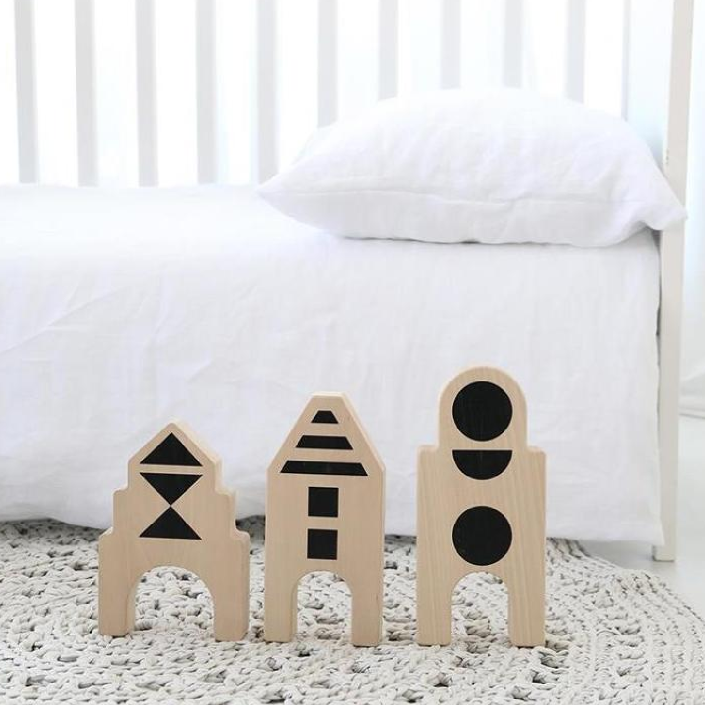 Beautiful figurines that form a modern village. Each building piece is hand painted, one side black and the other white.