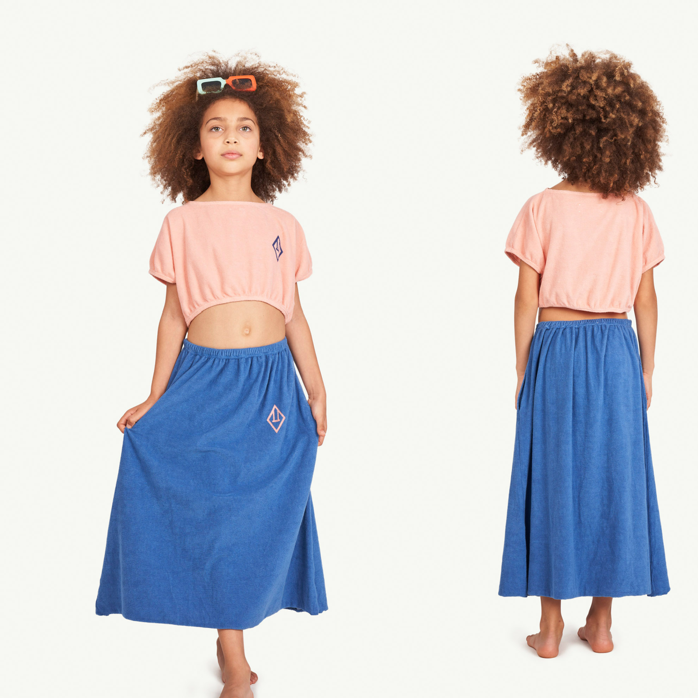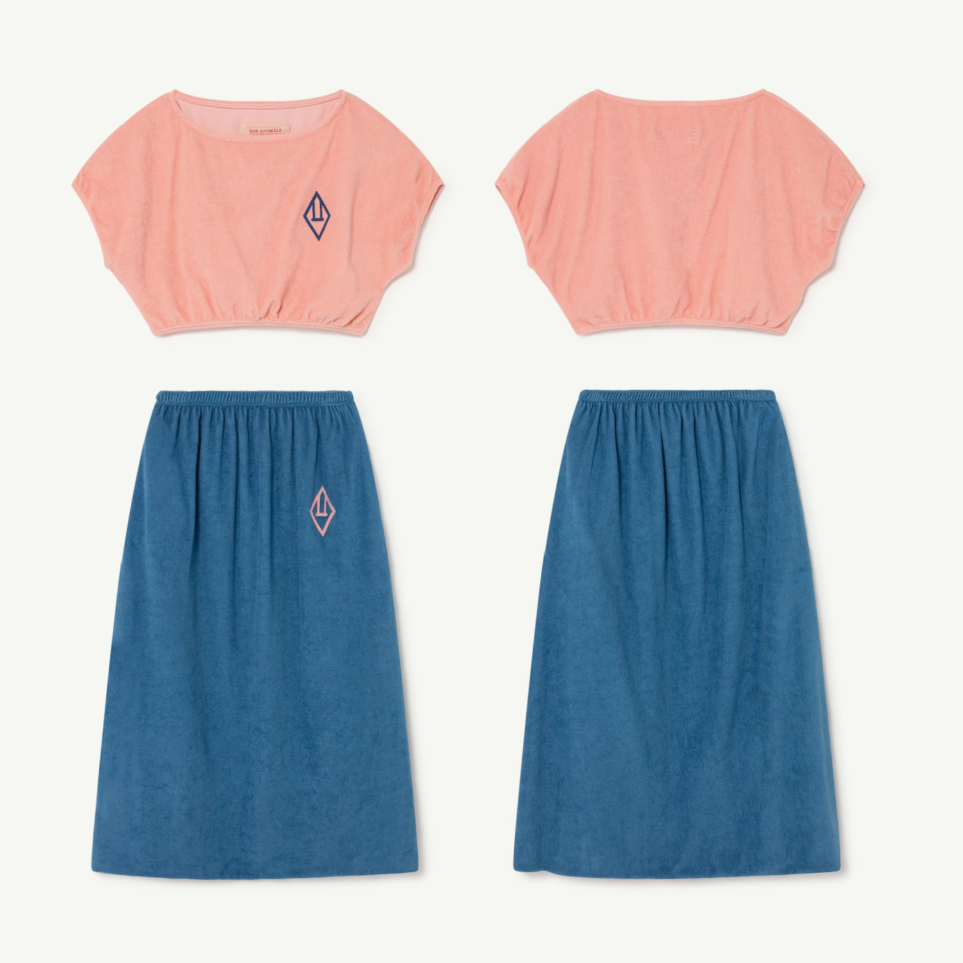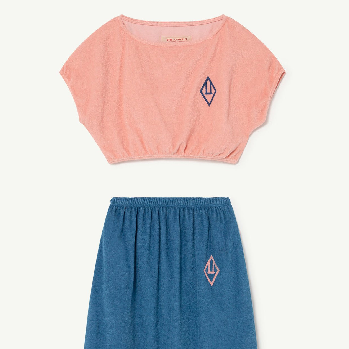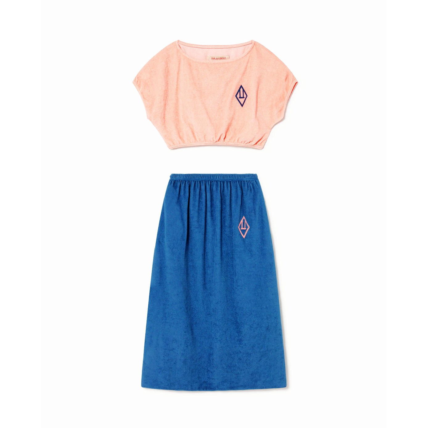 This set is gorgeous! Includes a cinched crop top and long skirt, both in terry featuring a TAO embroidered logo. Pieces in contrasting colors designed to wear together, but also rad apart.