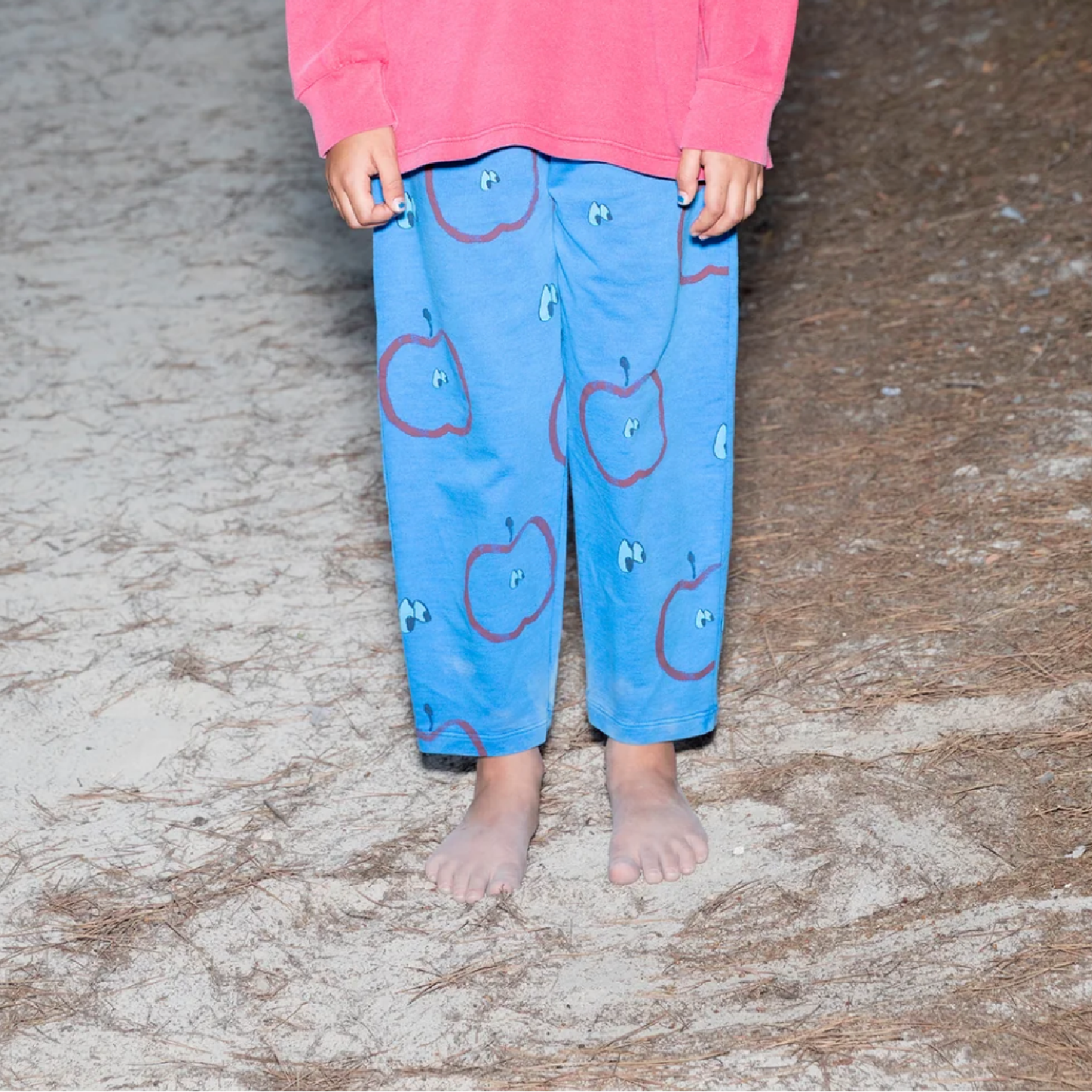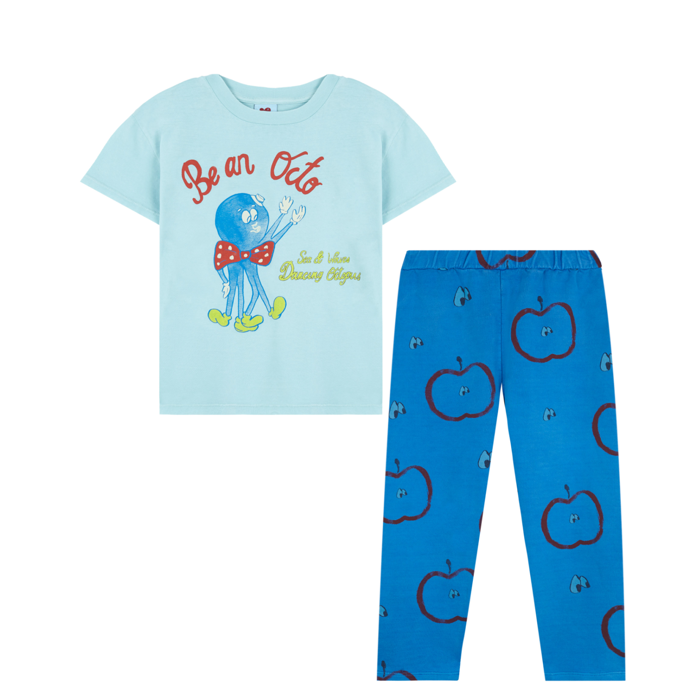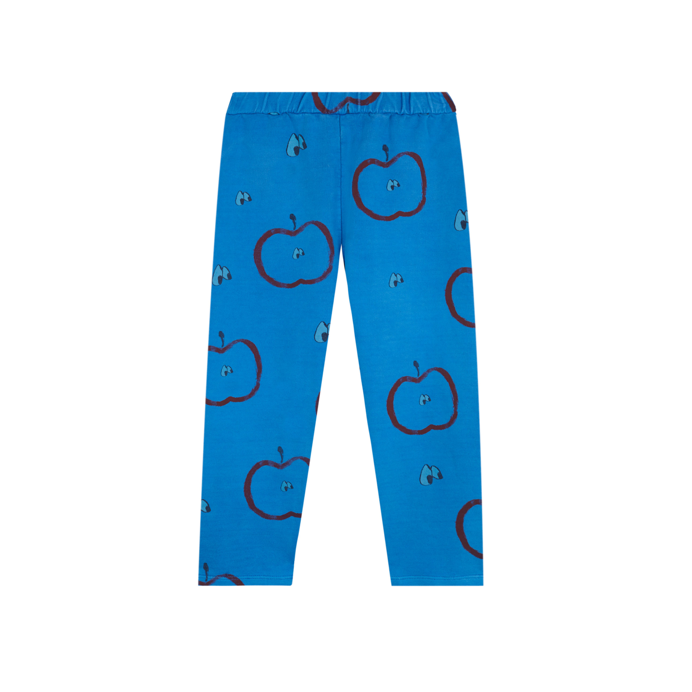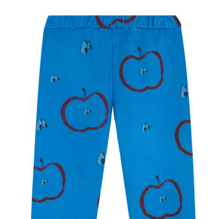 A rad loose fitting pant in blue, featuring an all over apple and eye print. Designed for boys and girls alike.