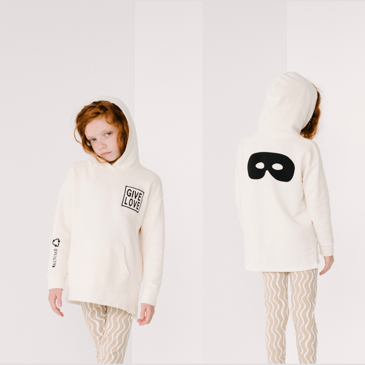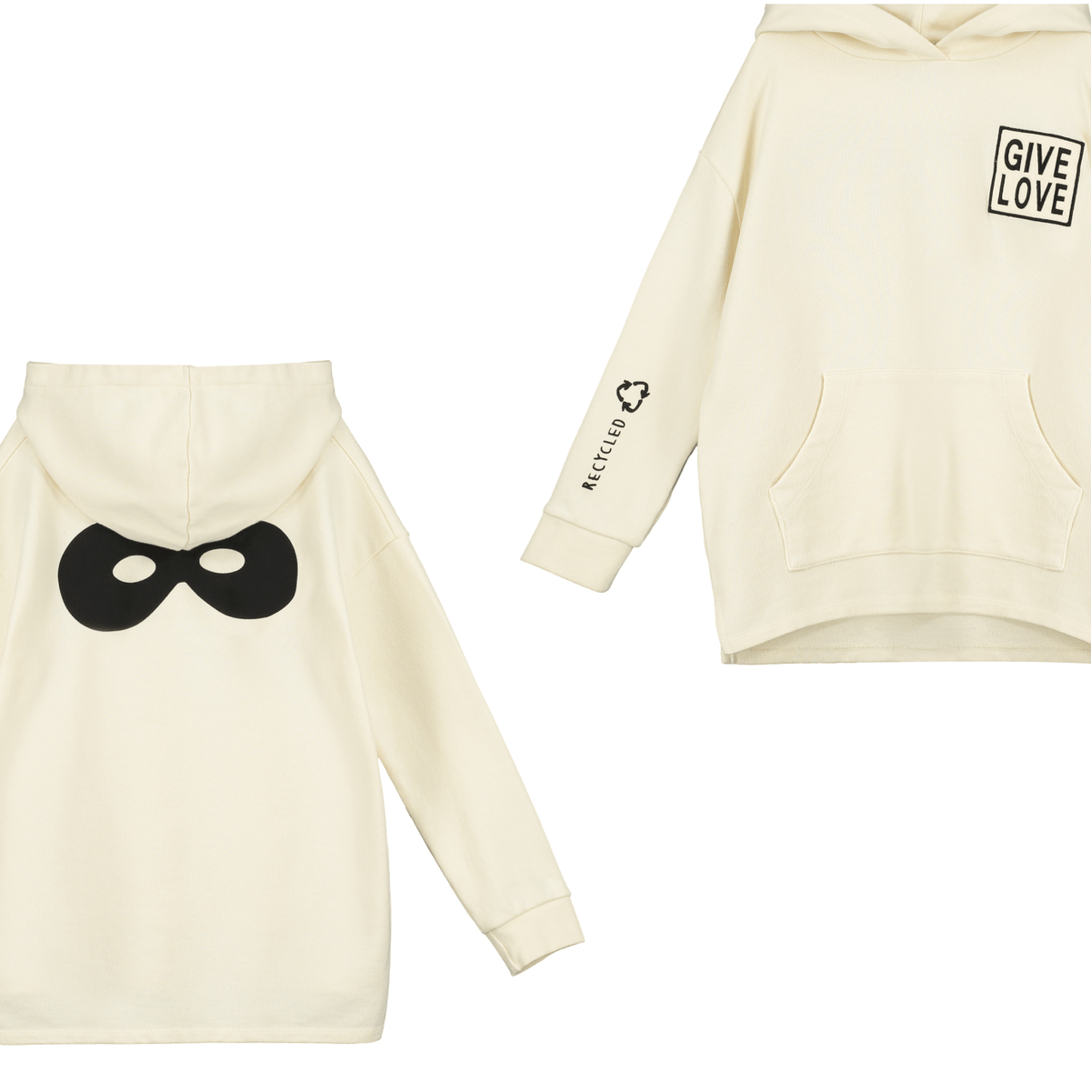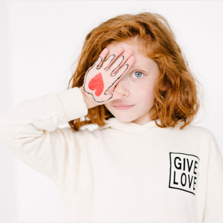 A rad sweatshirt with a front print featuring a message to remind all to GIVE LOVE the iconic Beau Loves Mask on the back side. Printed in black on an buttercream, off white base.