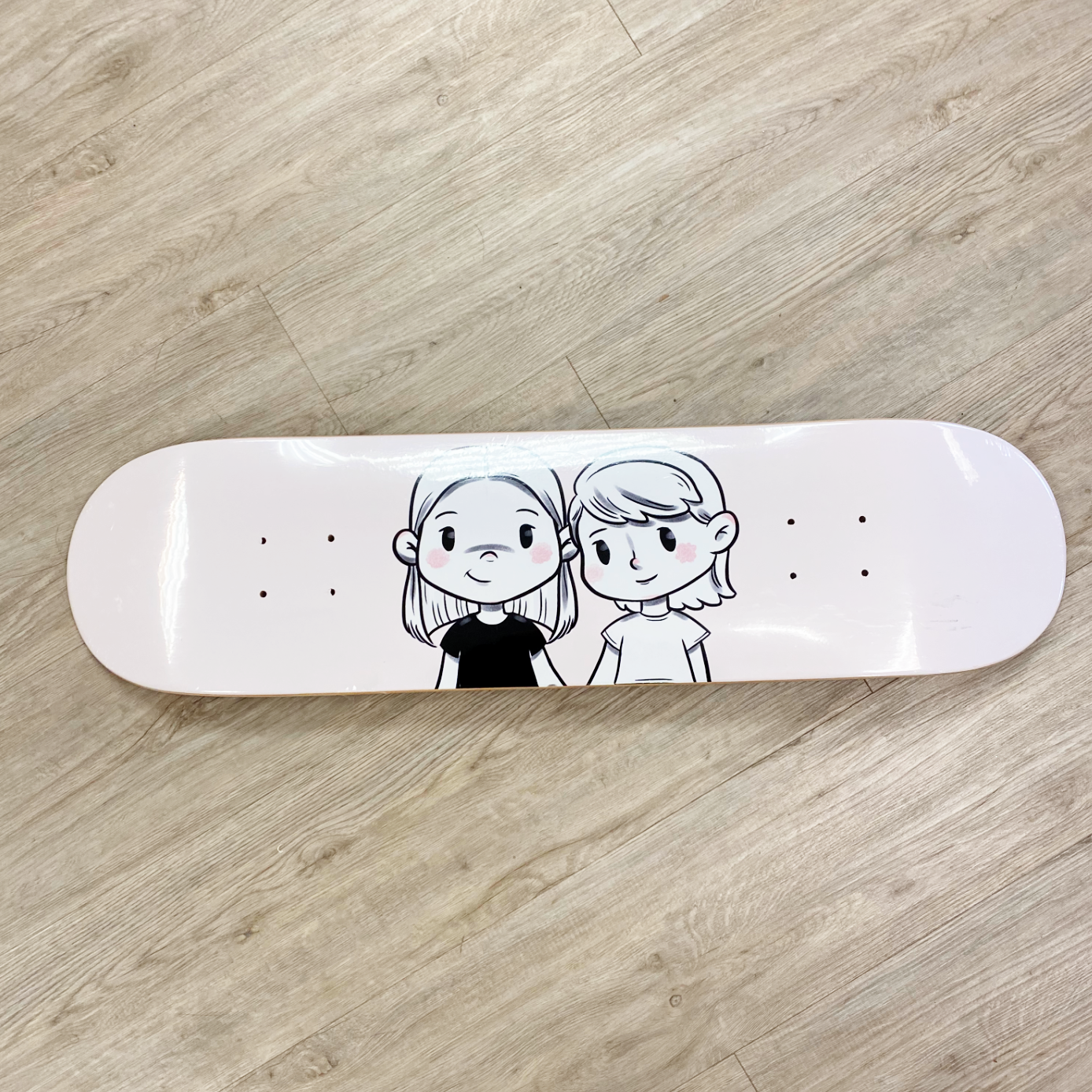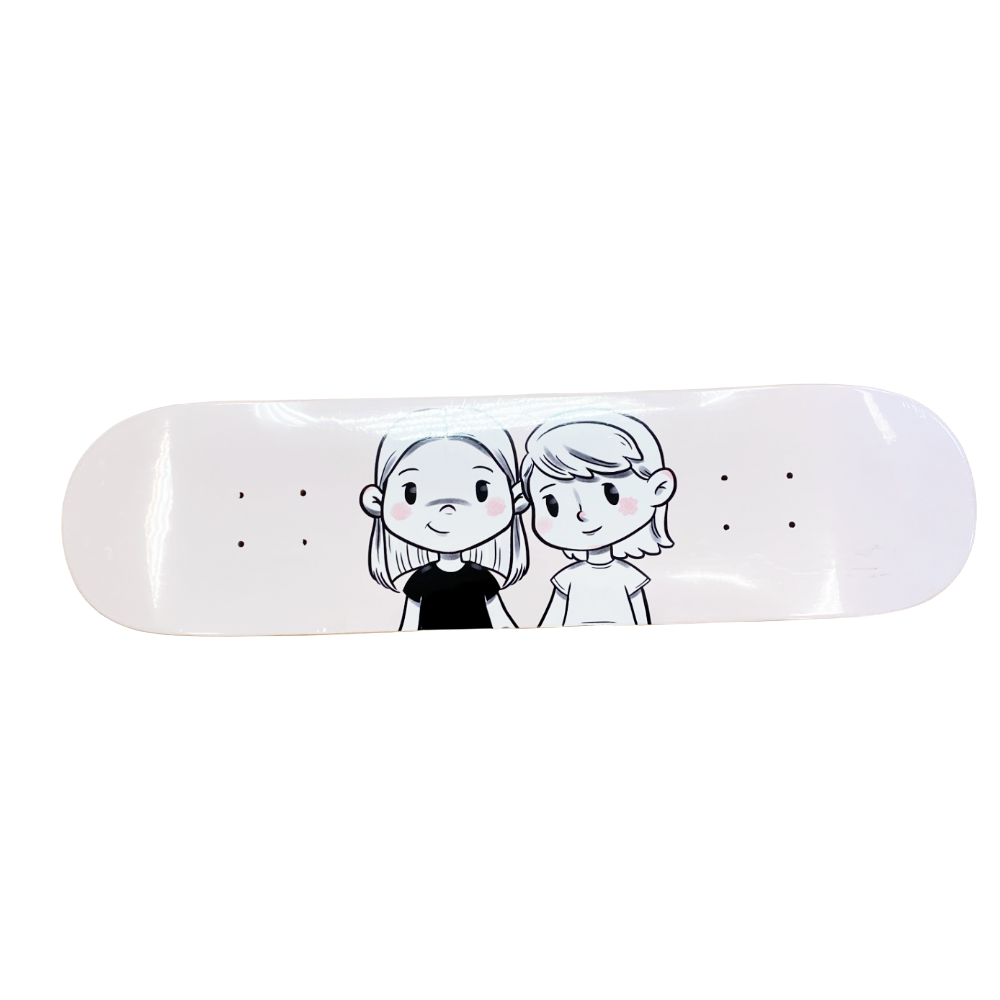 A custom designed skateboard featuring the artwork of artist Nazarina Jose Power. The artwork features a unique cartoon style of two sisters, Maya & Senna from their coloring book, A Coloring Story.