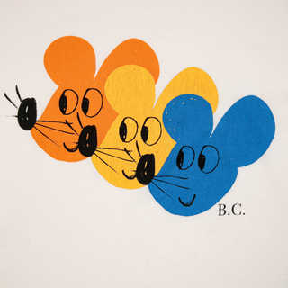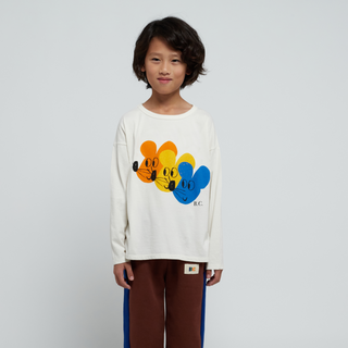 A relaxed fit long sleeve shirt featuring a tri color mouse print on the front on an off white base. Designed for boys and girls alike.