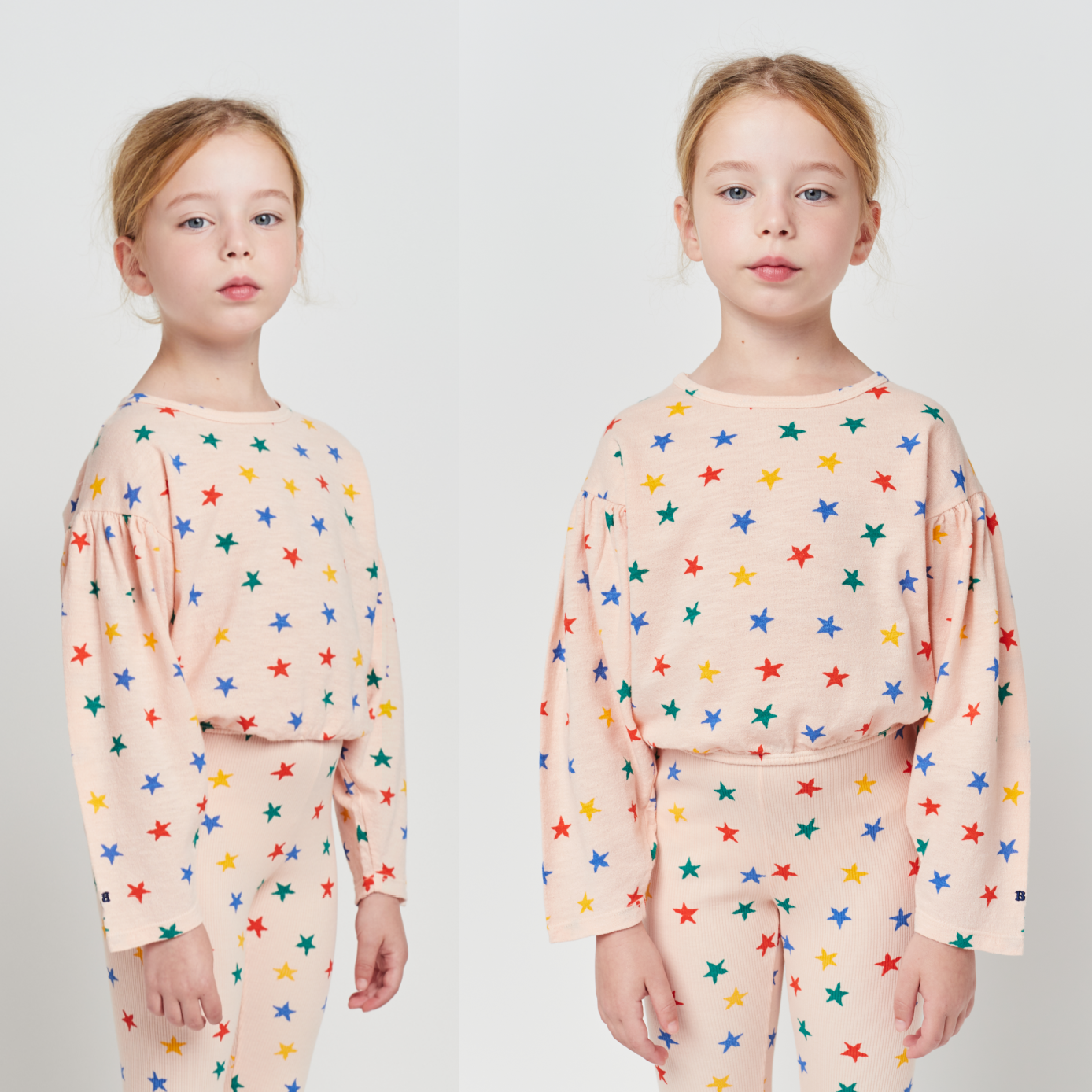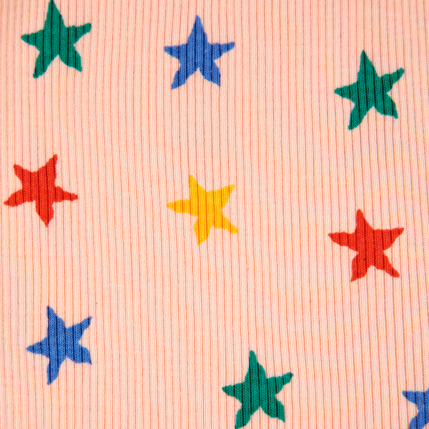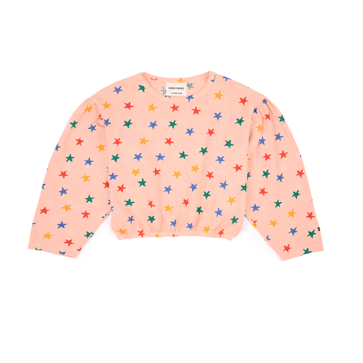 A beautiful long sleeve cropped shirt featuring an pink base and an all over colorful star print.