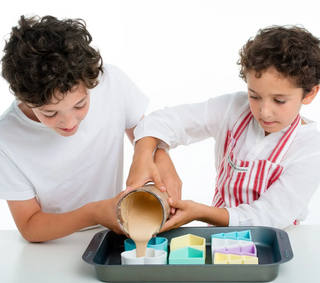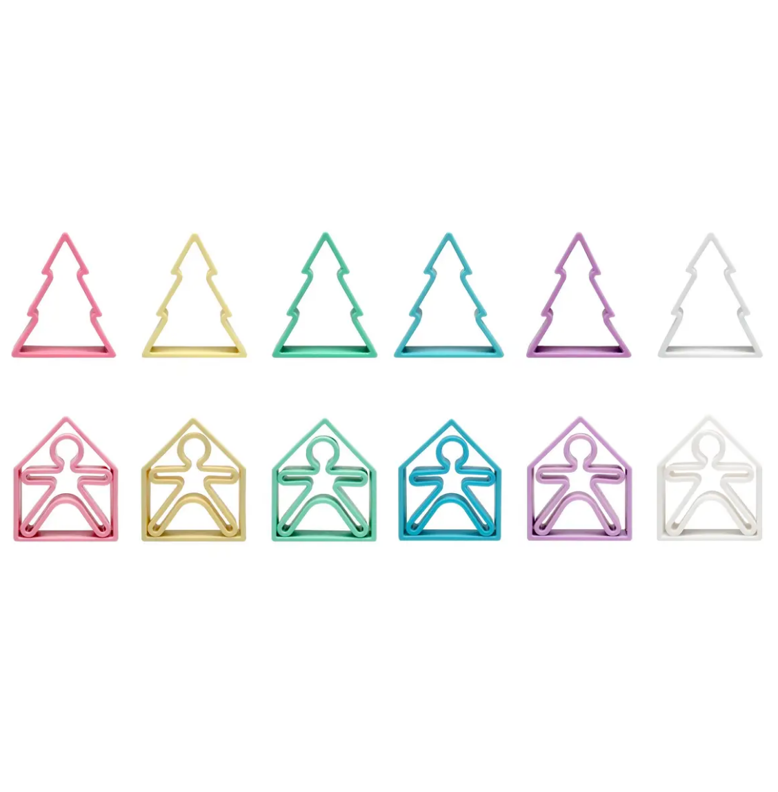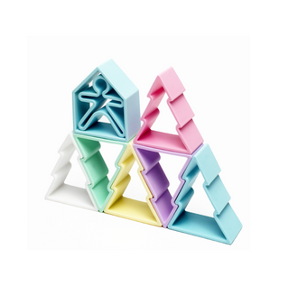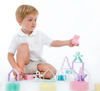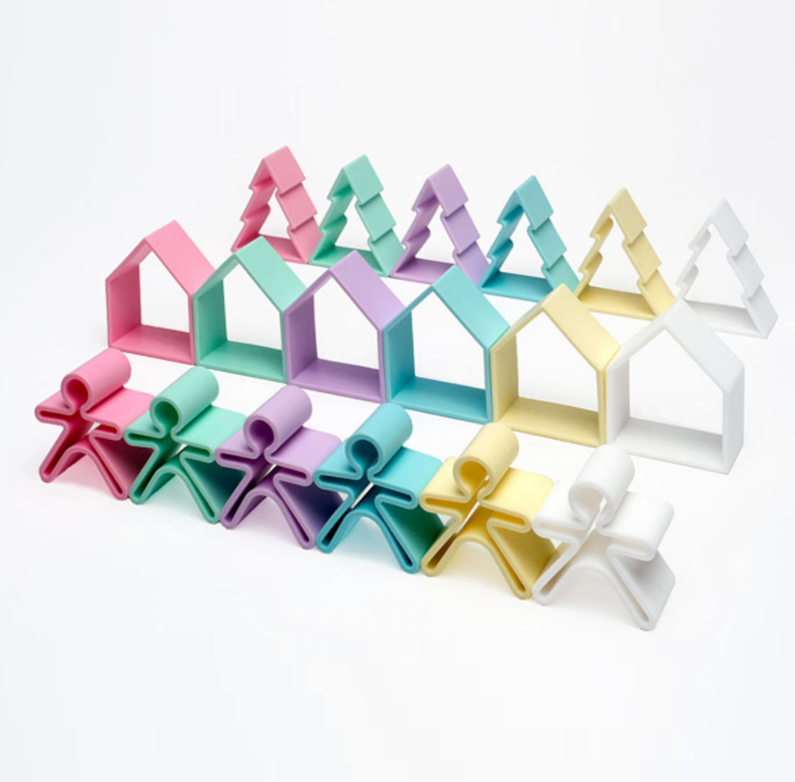A beautiful pastel play set featuring modern and simple silhouettes. A wonderful sensory toy for all ages.  Pieces can be used as teethers, puzzles, building blocks, dolls, even molds!  Platinum silicone is a soft material that feels great to babies and kids.