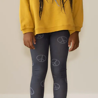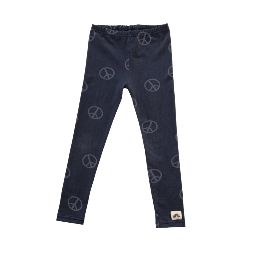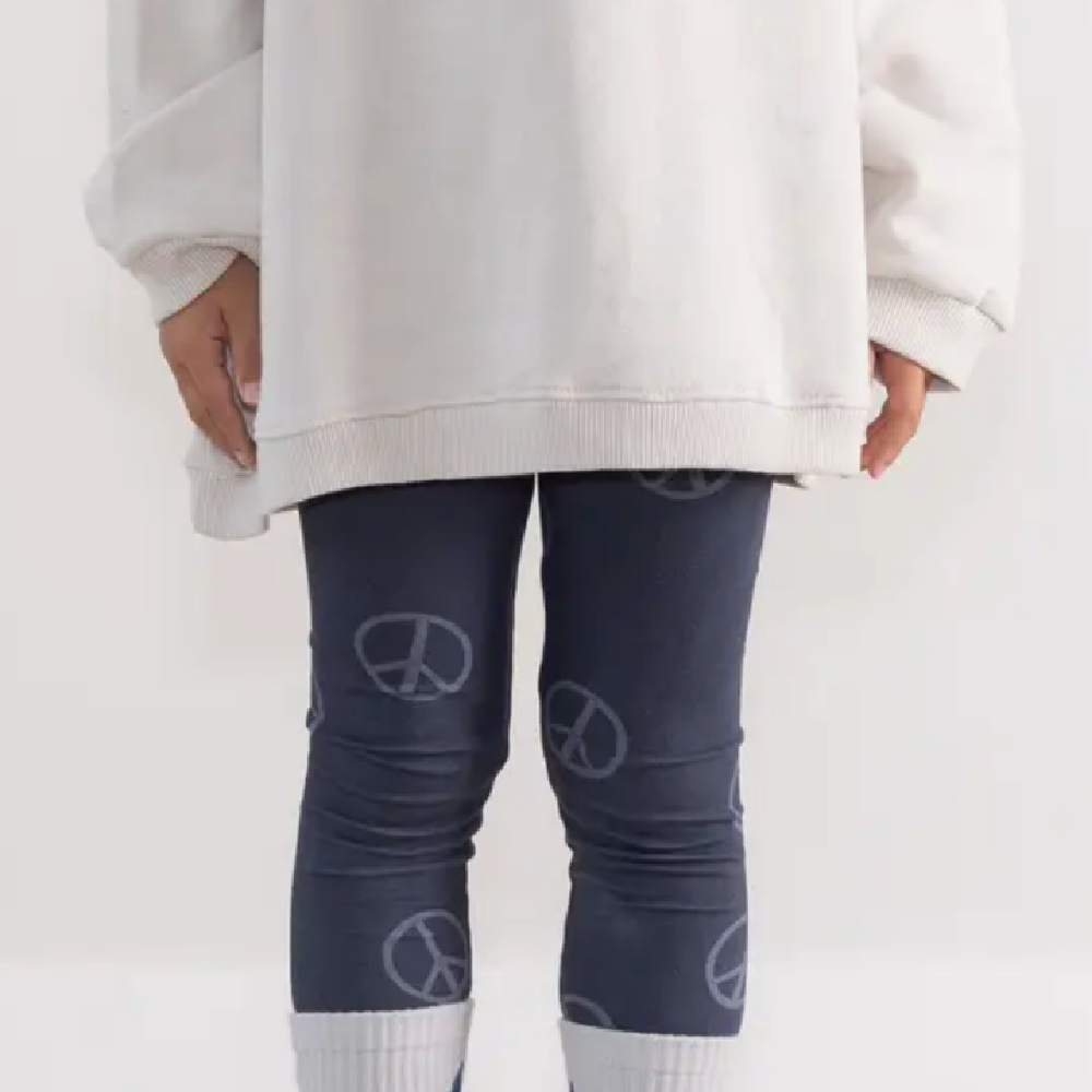 The perfect balance between fitting snug around the legs, but still comfy to play around and move in. These leggings feature a peace sign print on a rad blue color.