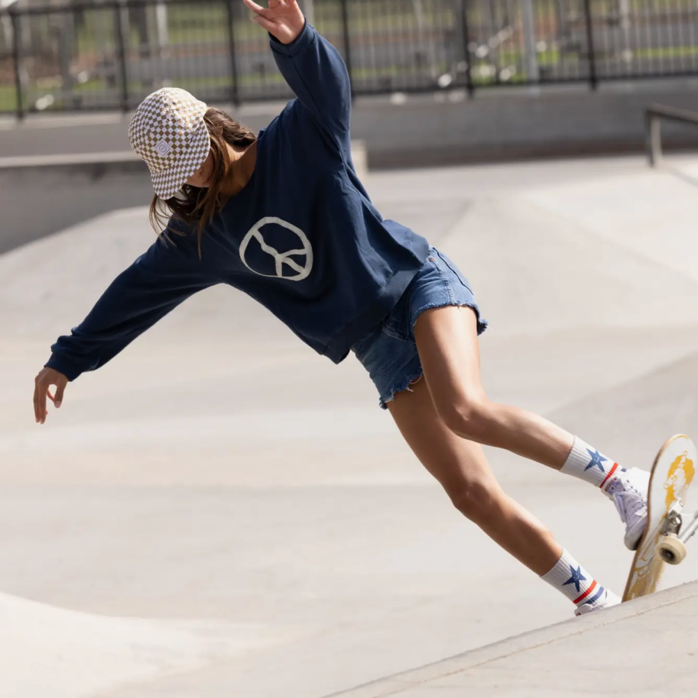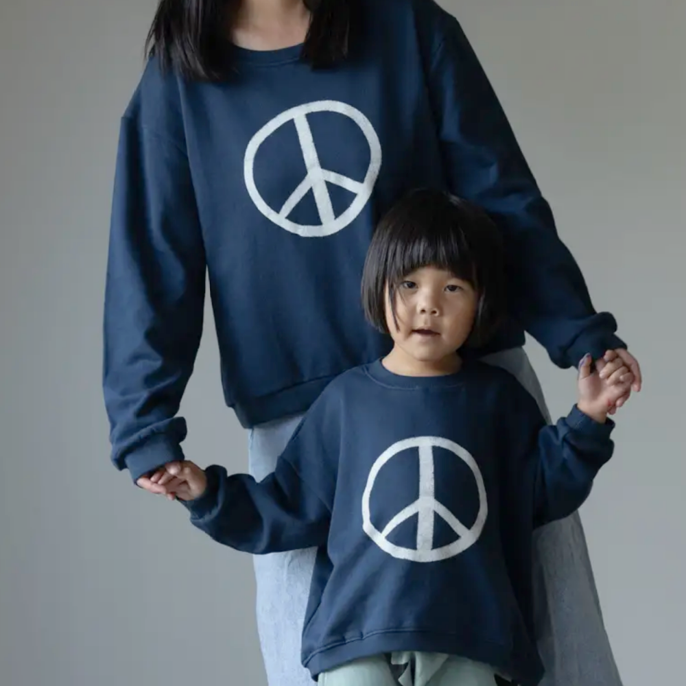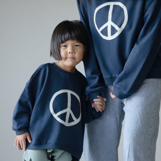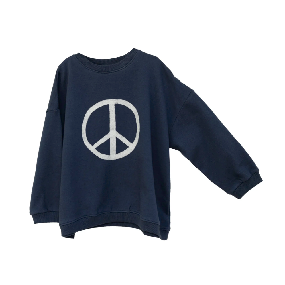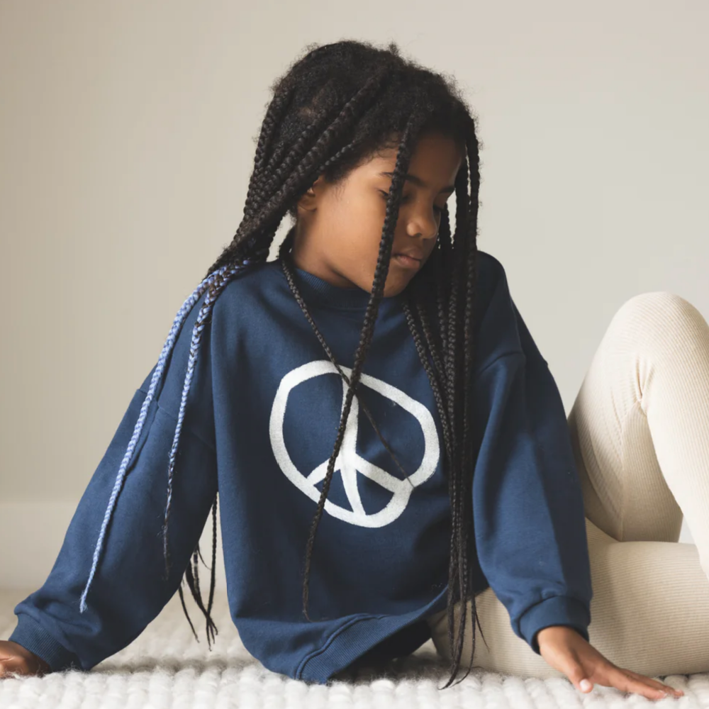 A wide fitting and super cozy long sleeve sweatshirt featuring a white peace sign print on the front on a navy blue base. Pair with matching leggings or favorite jeans for a super chic look. Designed for all.