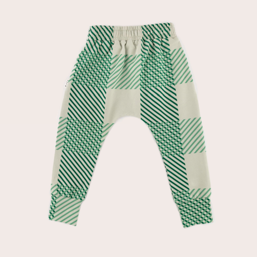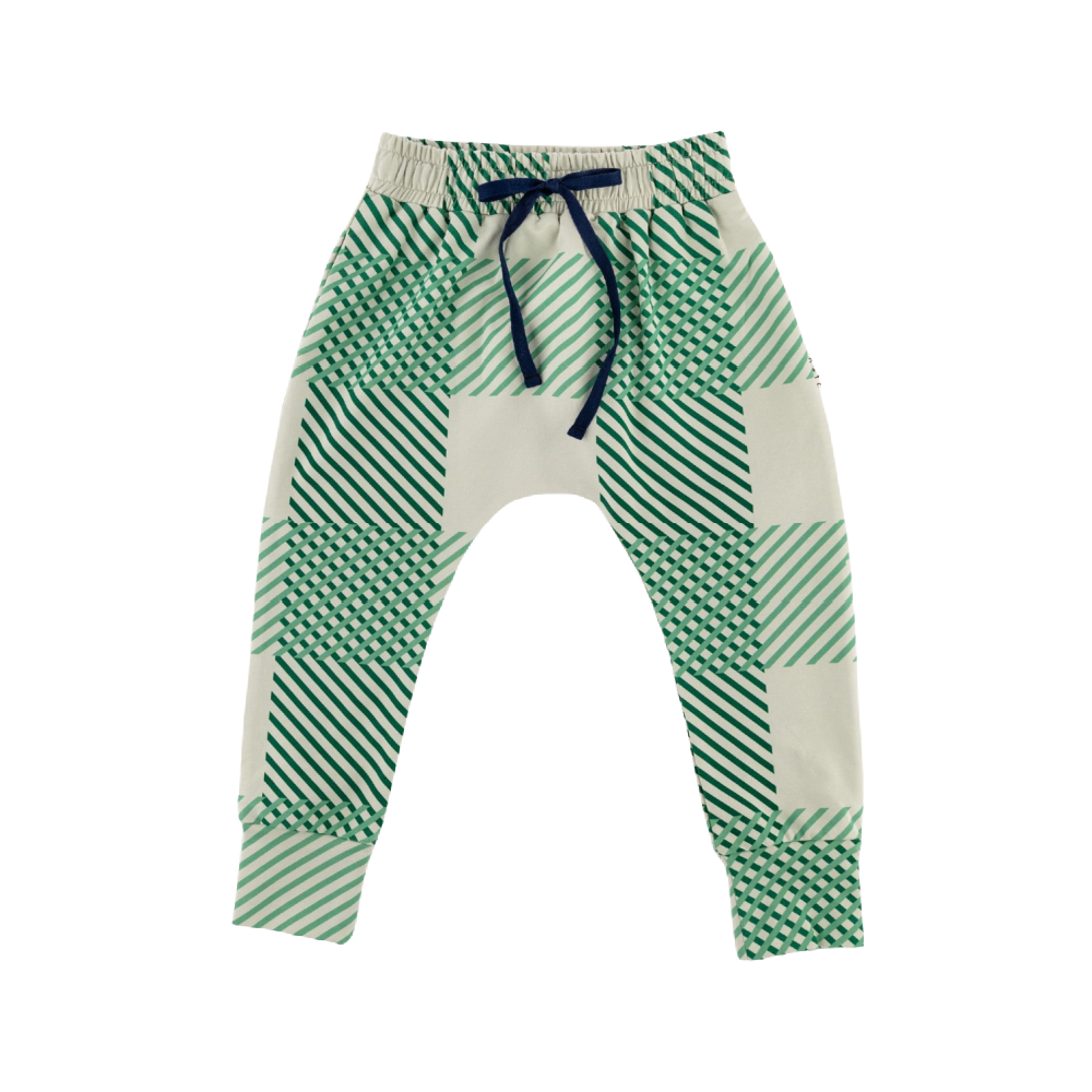 A fun take on plaid, this one isn't for your granny! Our most popular style pant, they look good but feel like track pants! Soft green base with shades of deeper green creating a unique plaid print... and pockets, of course!