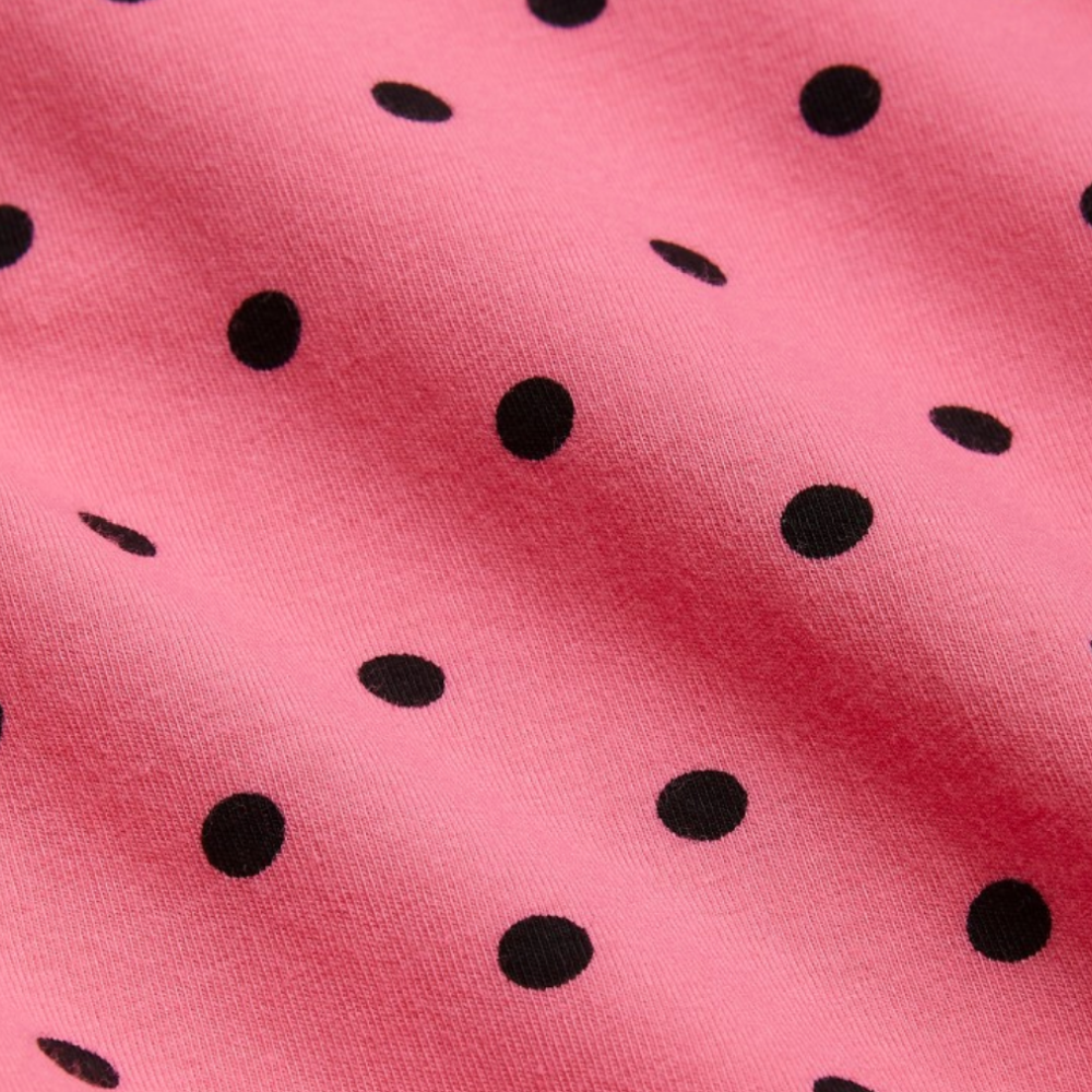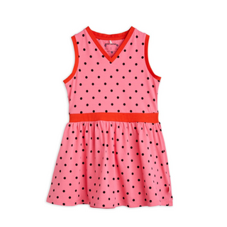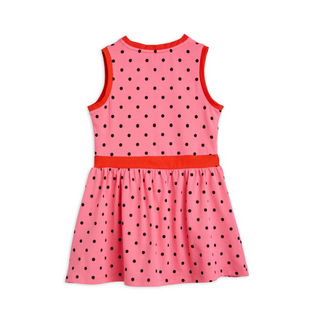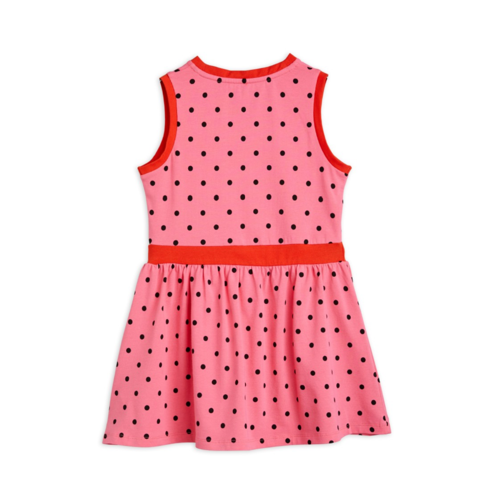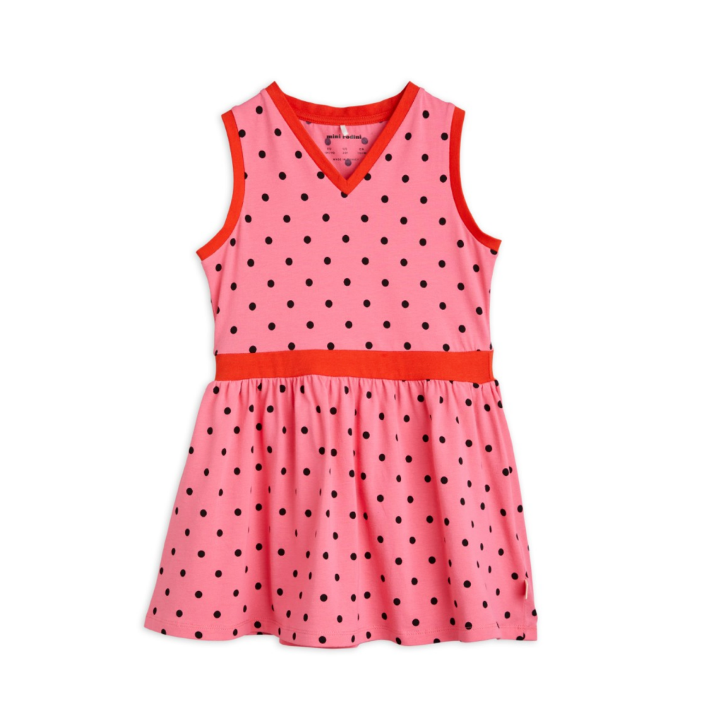 Pink sleeveless dress with an all over Polka Dots print with a v-neck, contrasting trimmings and waist. Finished with a folded Mini Rodini Panda label.