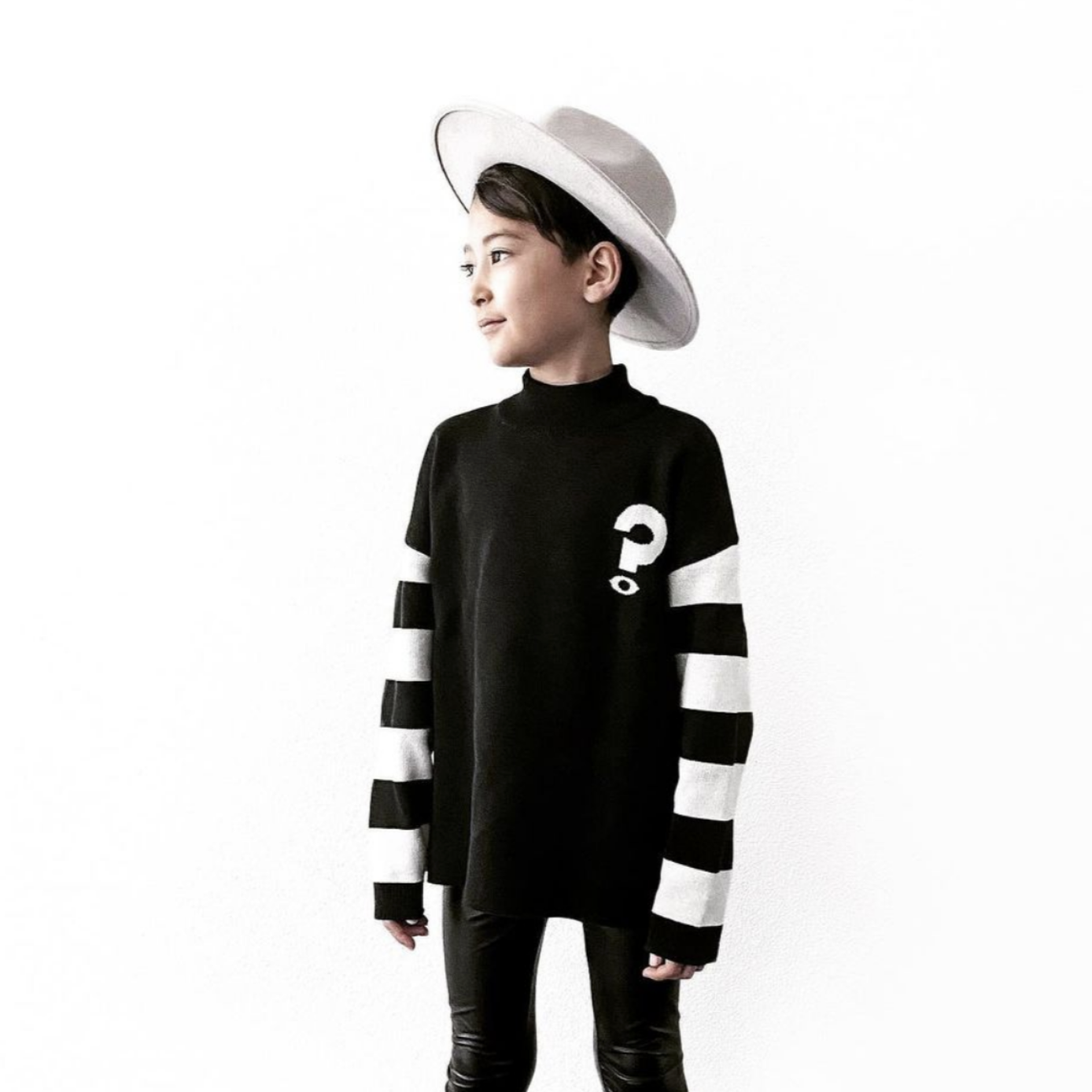 A relaxed fit funnel neck sweatshirt featuring a white question mark on the front side and striped sleeves.