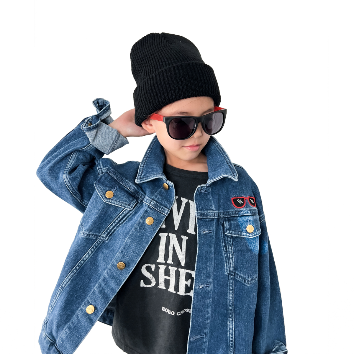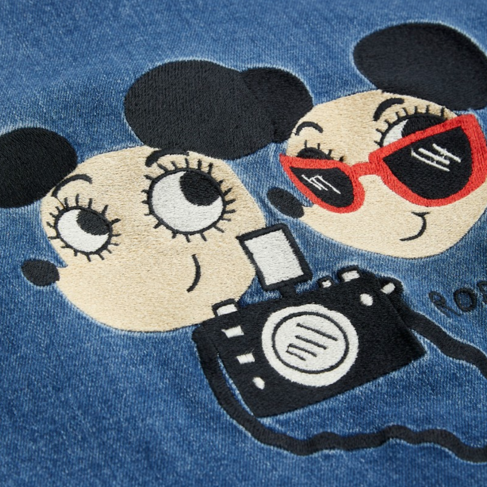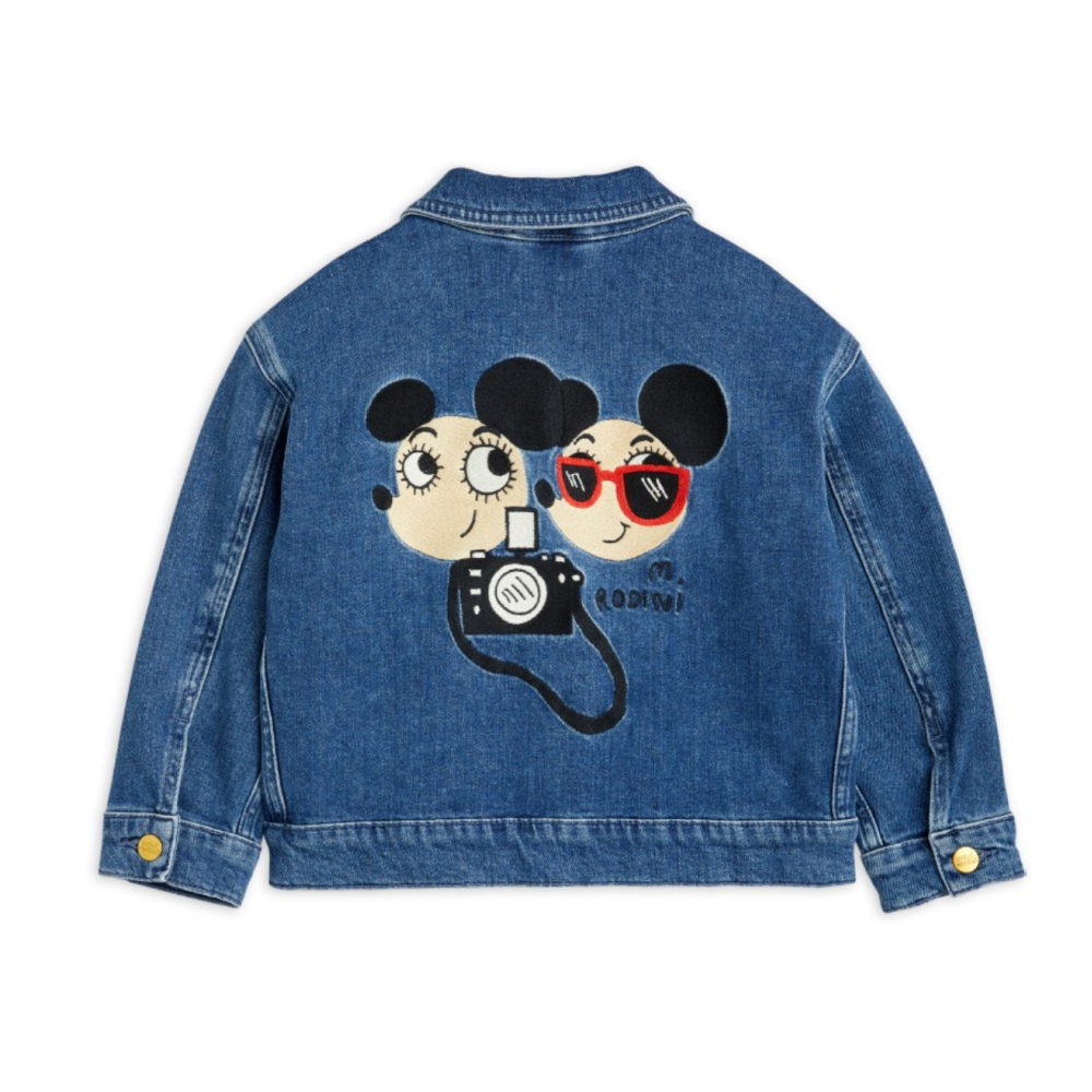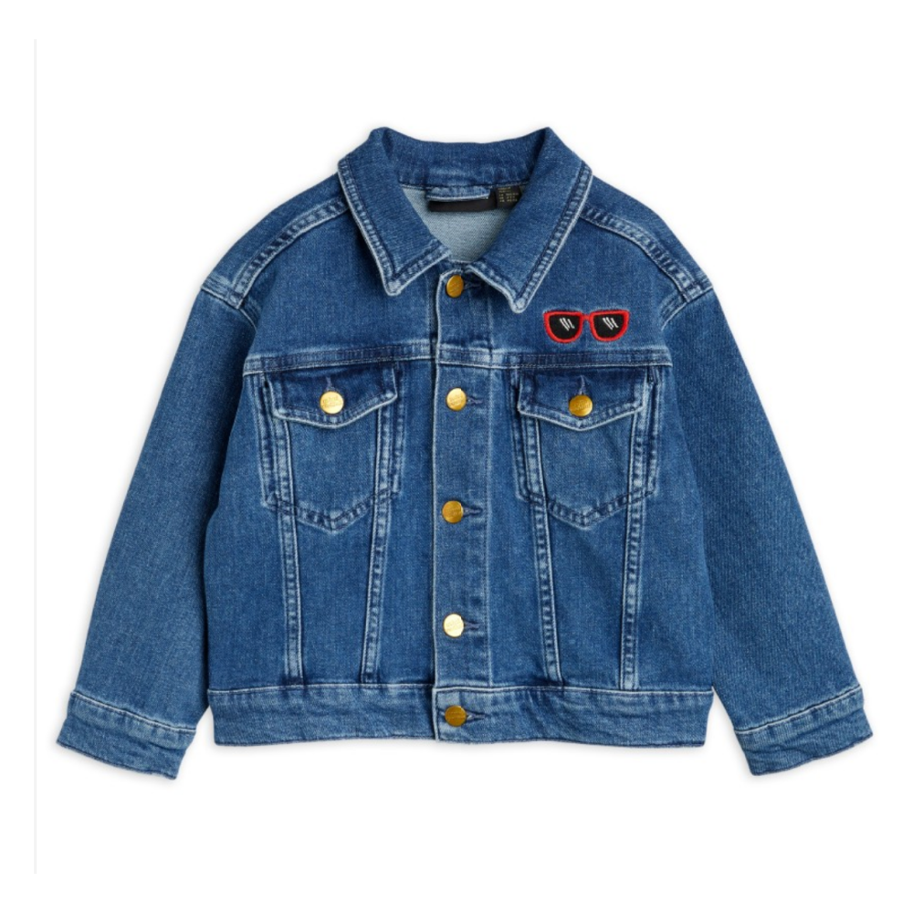 Denim jacket featuring a Sunglasses embroidery on the chest and a large embroidered Ritzratz artwork on the back, made from GOTS certified organic cotton with a hint of stretch. The jacket is designed with button closure, buttoned chest pockets, a classic collar and slightly dropped shoulders for a relaxed fit.