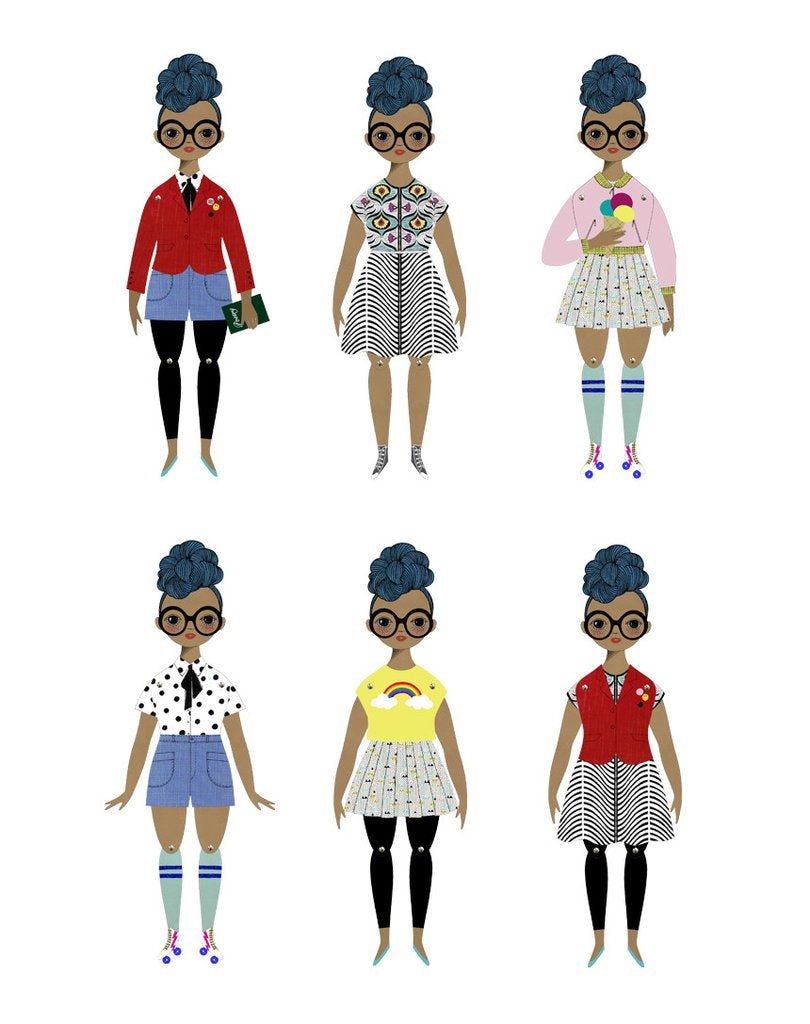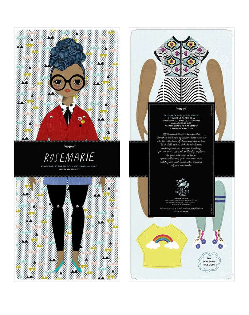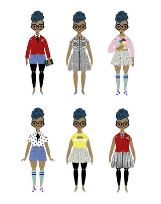 Inside this paper doll kit you will find an assembled paper doll and 2 sheets of outfits that are fully perforated and easy to punch out. All pieces and the paper doll can be stored in the enclosed envelope. Mini metal brads are used to assemble the doll and allow for playful movement. As you add new dolls to your collection, you can mix and match from each wardrobe, creating infinite new looks.